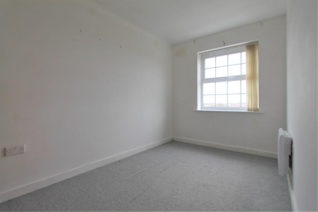 Second bedroom having wall mounted electric heater, carpet flooring and double glazed window to the front aspect.
