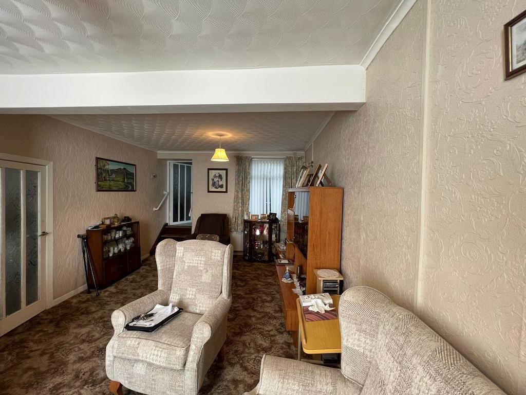 UPVC double-glazed windows to front and rear with made to measure blinds, papered décor, patterned artex and coved ceiling, two wall light fittings to remain, fitted carpet, two central heating radiators, ample electric power points, patterned glaze panel door to rear allowing access to kitchen/breakfast room.