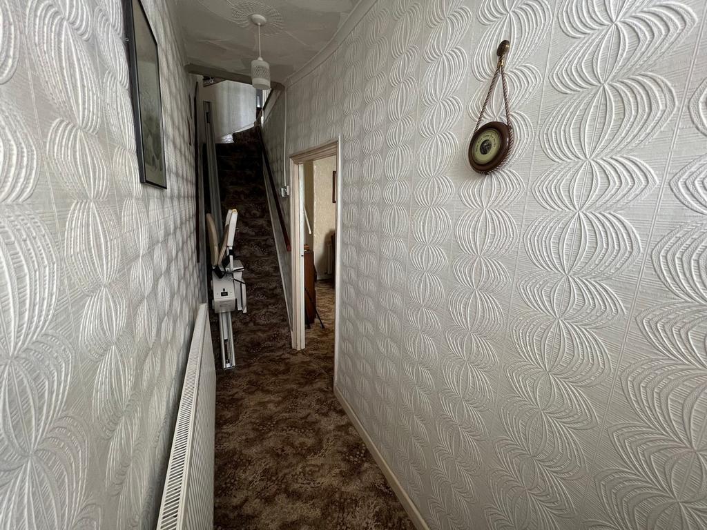 Papered décor, patterned artex and coved ceiling, wall-mounted and electric service meters, fitted carpet, radiator, staircase to first floor with matching fitted carpet, patterned glaze panel door to side allowing access to lounge/diner.
