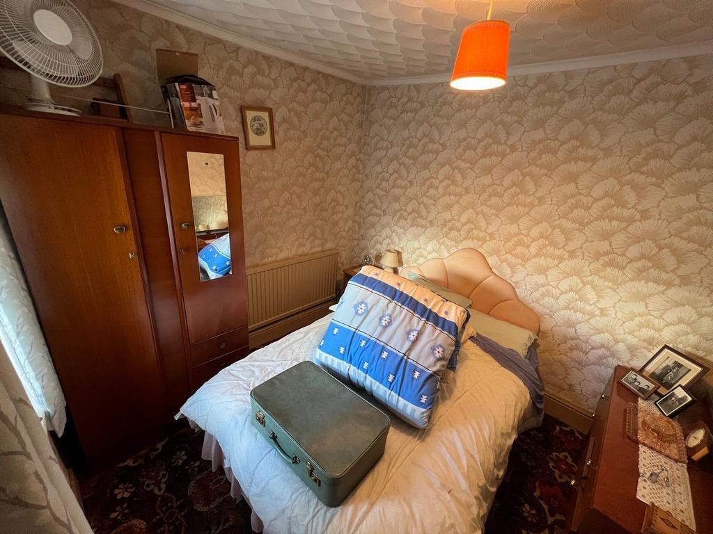 UPVC double-glazed window to front with made to measure blinds, papered décor, patterned artex and coved ceiling, wall light fitting, fitted carpet, radiator, electric power points.