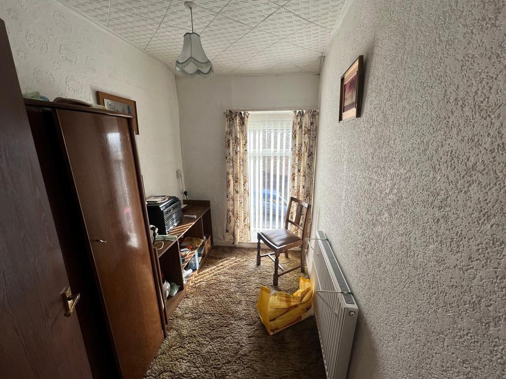 UPVC double-glazed window to front with made to measure blinds, papered décor, tiled ceiling, fitted carpet, radiator, electric power points.