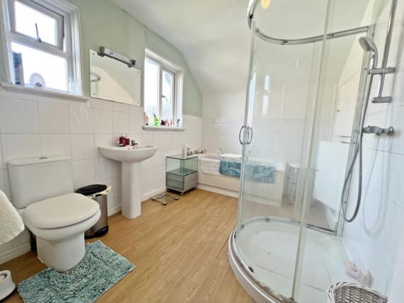 FAMILY BATHROOM (10'3" x 7'5") Suite comprising panelled bath, shower cubicle, Pedestal wash hand basin, WC. Half titled walls. Wall mounted mirror. Extractor Fan. Laminate flooring.