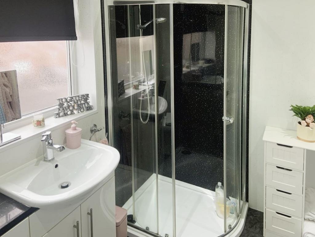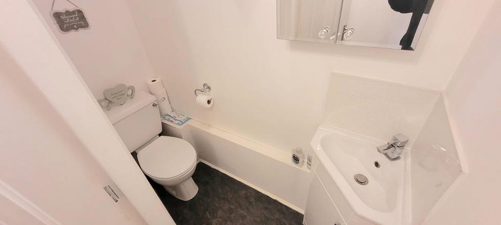Low level WC, paneled bath, shower cubicle, vanity wash hand basin, radiator and double glazed window to front elevation.