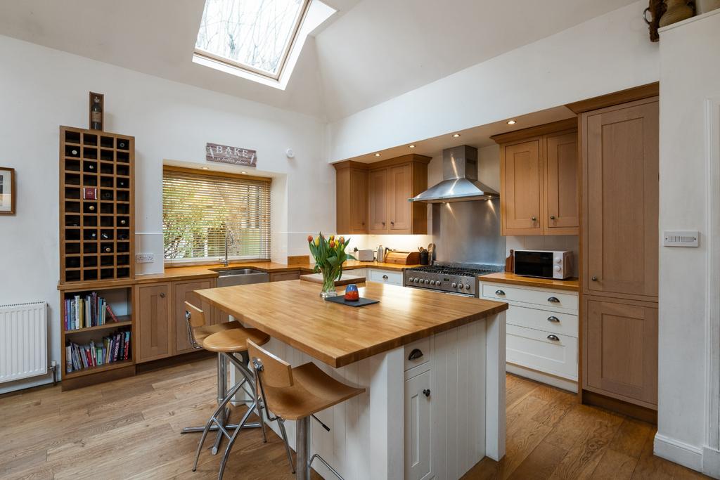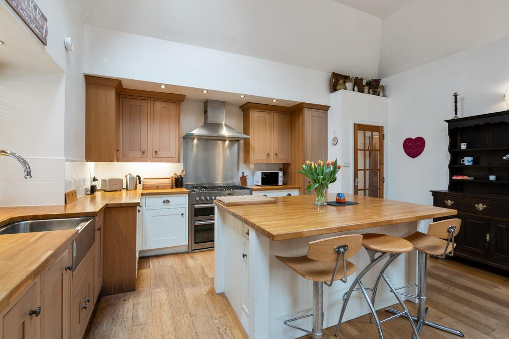 This family home boasts many original features including high ceilings and sash and case windows. The property is entered via a welcoming and bright inner hallway. Immediately to the right, there is a large double bedroom situated to the front of the property with natural stripped wood flooring and views over the front garden. To the left is the lovely front sitting room with an attractive feature window with window seat, feature log burner stove with slate hearth and attractive shelved recess. Two solid wood steps lead through to the back hallway. There is a further large double bedroom located off which could be flexible for a variety of uses depending on your family needs. The family bathroom boasts a white suite and shower over the bath along with ladder towel radiator with frosted double window to the side and another larger internal window. There is a useful utility porch/boot room with access to outside and both of these rooms are located to the rear of the house. The open plan feature kitchen/family room is the heart of this beautiful home. The room is part of the original building but has been opened up into the attic space to provide a vaulted ceiling with Velux windows providing ample natural light. The elegant kitchen has been thoughtfully styled and comes complete with a wide range of wall and base units and coordinating solid oak worktops and a large feature central island. There is a range of integrated appliances along with six burner Range oven and chimney hood. The open plan room offers ample space for a large family dining area and a family sitting area, with solid oak flooring throughout. The room also boasts bi folding doors which open out onto a sunny patio and attractive rear gardens.