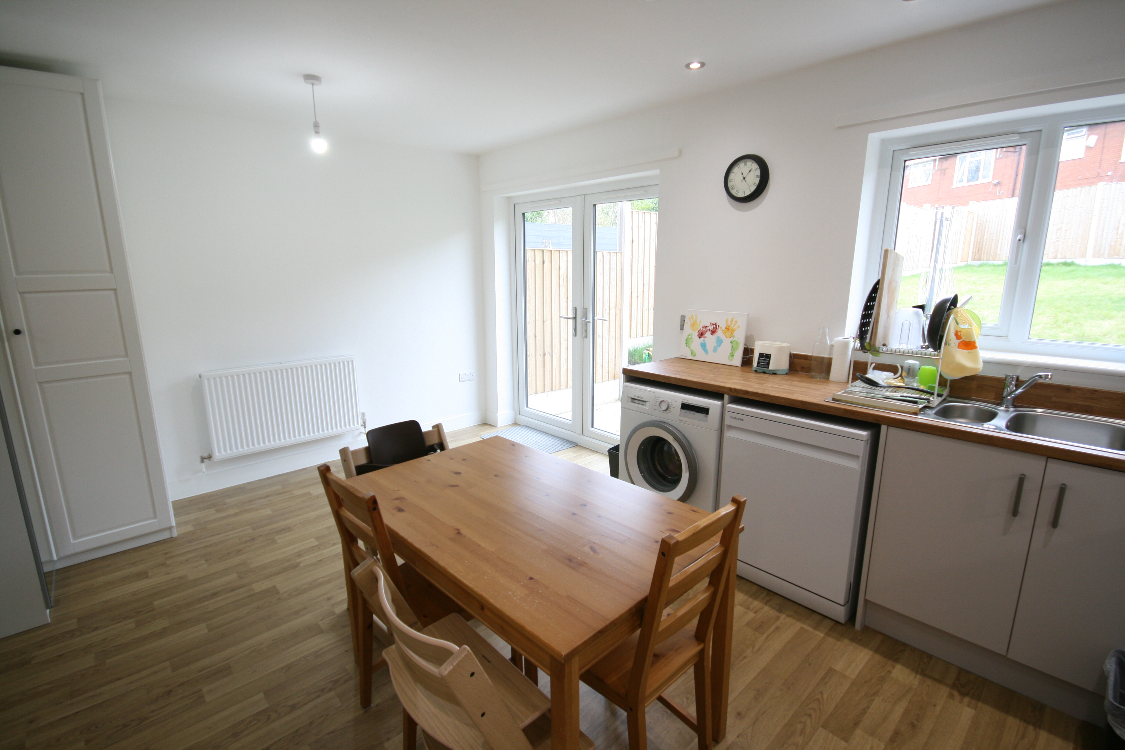 Fully fitted Grey modern kitchen comprises of wall & base units, matching work surfaces, integrated oven, hob & extractor fan, fridge freezer, plumbed for washing machine, dishwasher, power points, radiator, UPVC double glazed window with a rear aspect view & UPVC patio doors leading to rear gardens.