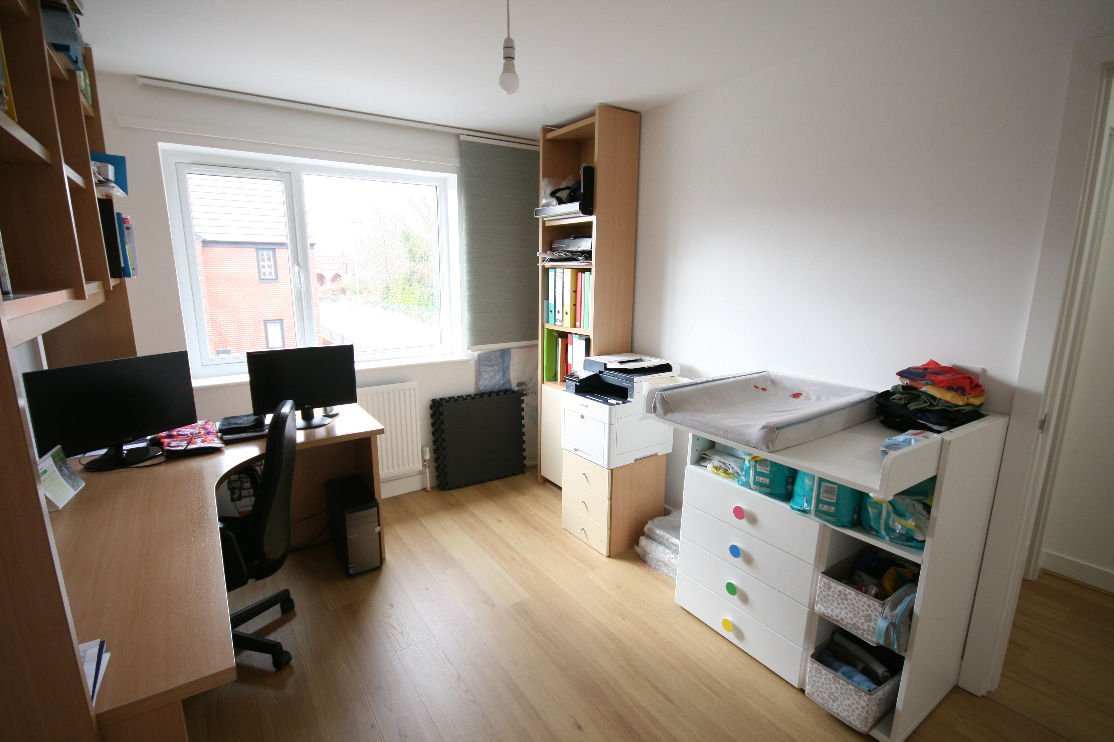 Fourth bedroom comprises of laminate wooden flooring, neutral decor, power points, radiator & UPVC double glazed window with a front aspect view.
