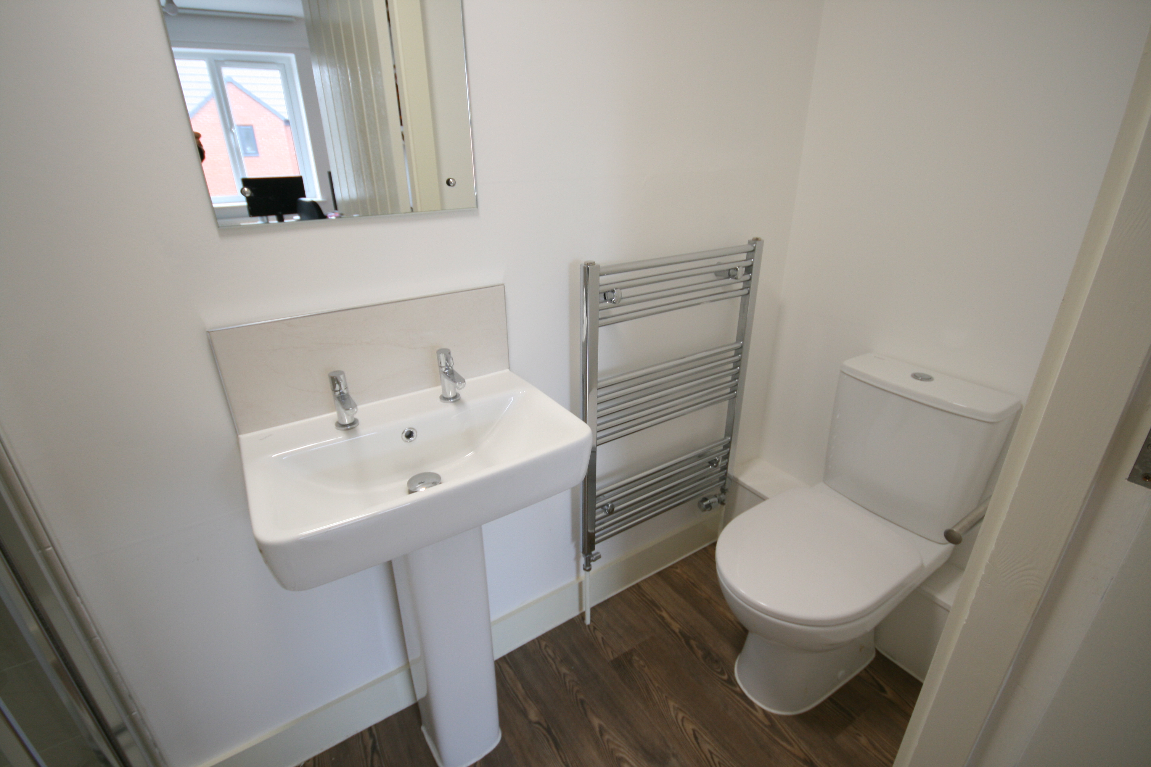 Downstairs WC comprises of white two piece bathroom suite, wash basin, WC, matching accessories & UPVC double glazed window with frosted glass insert.