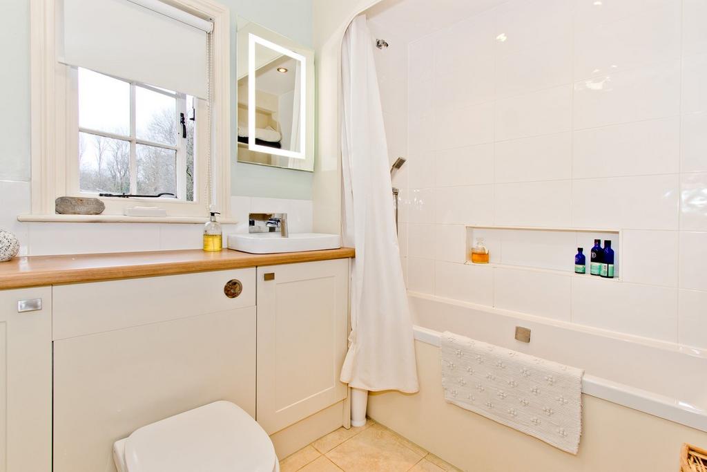 8' 1" x 6' 7" (2.46m x 2.01m) With window to rear, white panelled bath with tiled enclosure, fitted cabinets incorporating a concealed cistern wc and vanity sink unit.