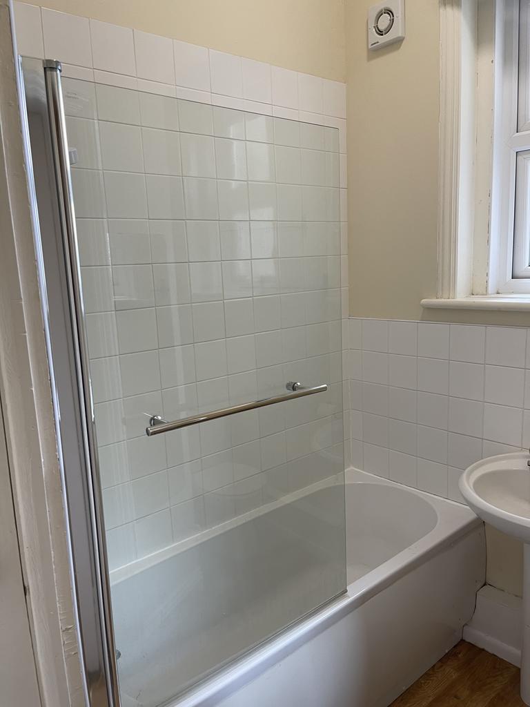 A functional, modern kitchen features ample storage and worktop space, paired with classic timber-effect flooring for warmth and practicality. The bathroom is well-appointed with a full-size bath and shower over, white suite and attractive natural wood flooring.
