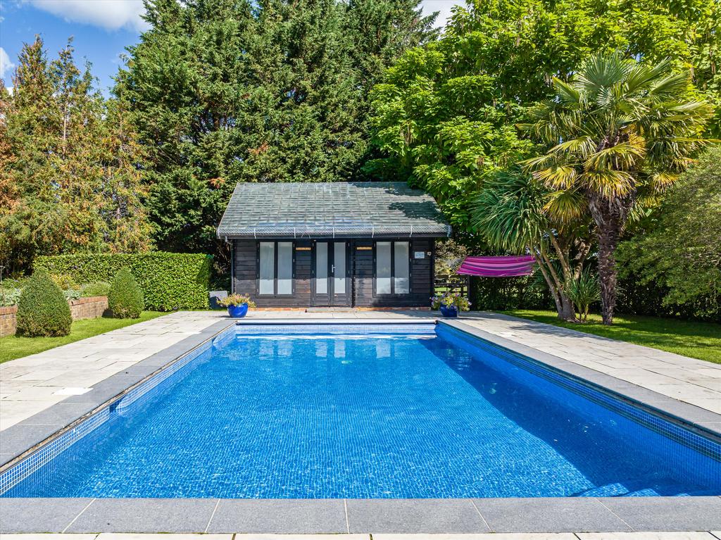 In the formal gardens there is a large terrace with a stunning pool complete with electric safety cover. The pool house is currently used as a gym with a WC. The gardens extend well beyond the swimming pool with mature trees, shrubs and borders which are filled with colour throughout the year. There is a lovely wildlife pond and expansive areas of lawns as well as a lean to greenhouse with a tiered cutting garden and a large vegetable garden.