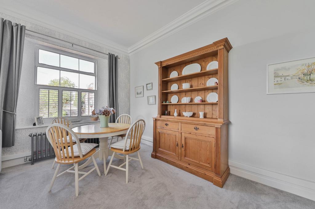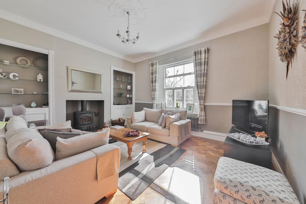 Enjoying views to the south over the meadow. Includes recessed cupboards to both sides of the chimneybreast, inset fireplace with woodburning stove and oak parquet flooring.