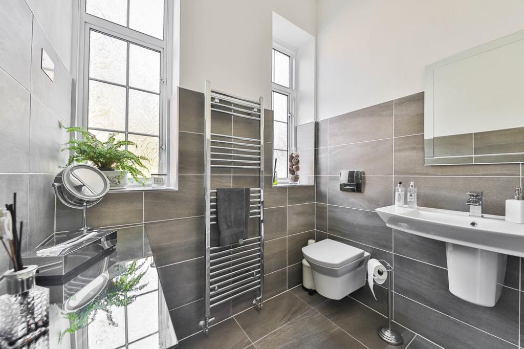 Containing a four piece suite comprising shower cubicle, free standing bath, low level w.c. and wash hand basin plus heated towel rail.