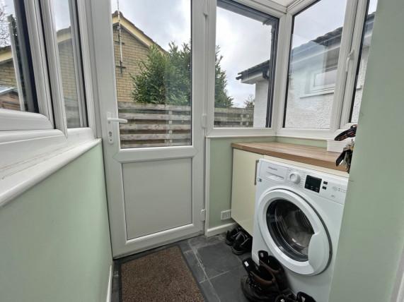 UTILITY ROOM (59 x 36 approx) Dwarf wall and uPVC construction. Plumbed for washer/dryer. Gloss base unit with laminate worktop over. Tiled flooring. Door to the rear garden.