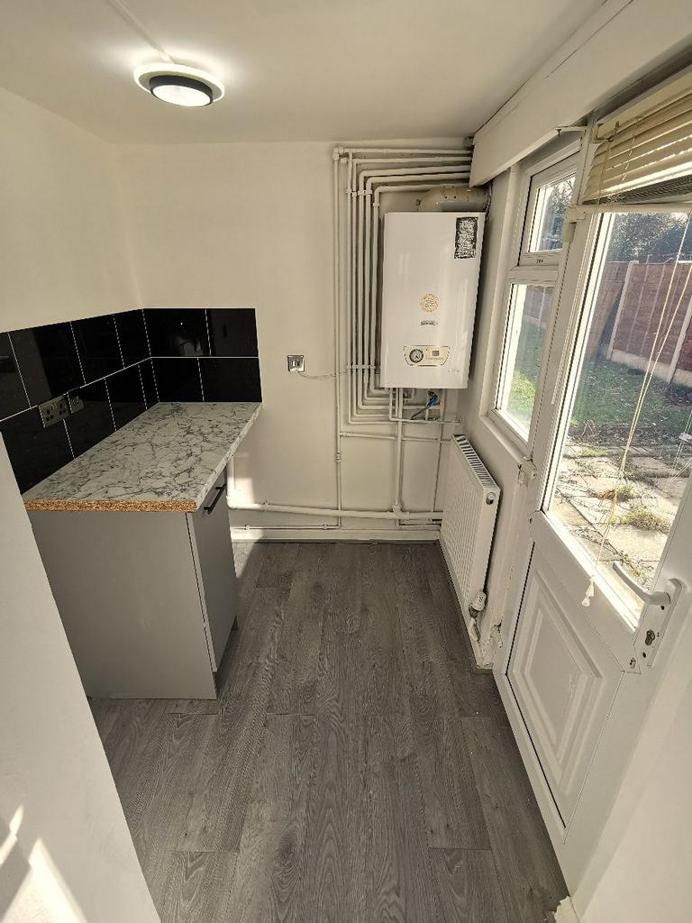 Double glazed window to the right aspect. Double glazed uPVC door leading to the rear garden. Heating radiator. Ceiling light point, Electric points. Gas boiler location.