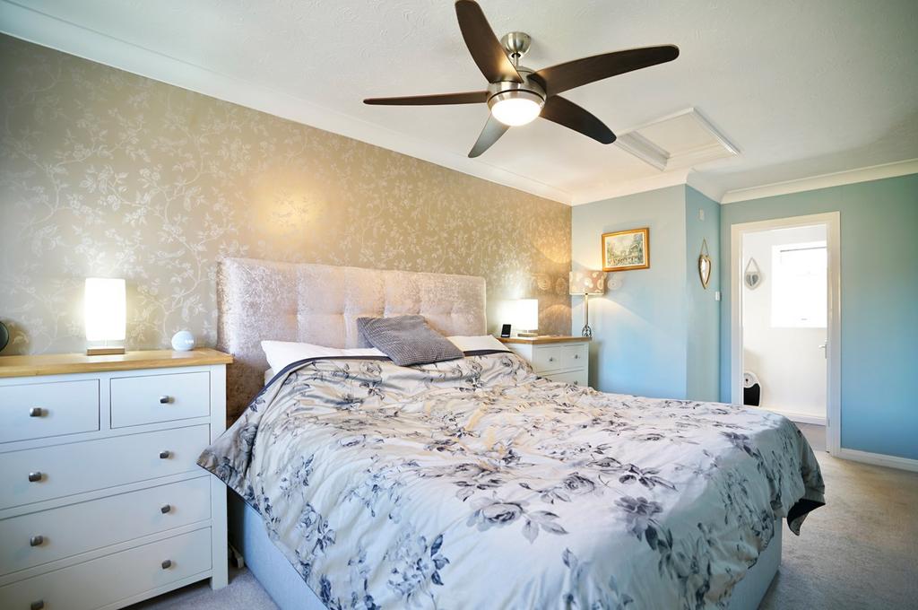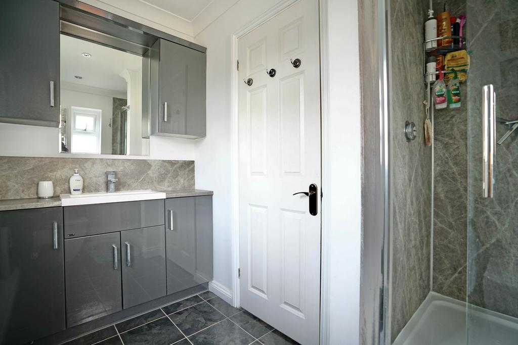 A double aspect room with UPVC windows to front and side, re-fitted in a three piece suite contemporary white suite comprising low level WC with concealed cistern, vanity wash hand basin with cabinet storage, vanity mirror and wall units, oversized screened shower enclosure with independent shower unit fitted over, recessed lighting, chrome heated towel rail, shaver points, composite floor covering.
