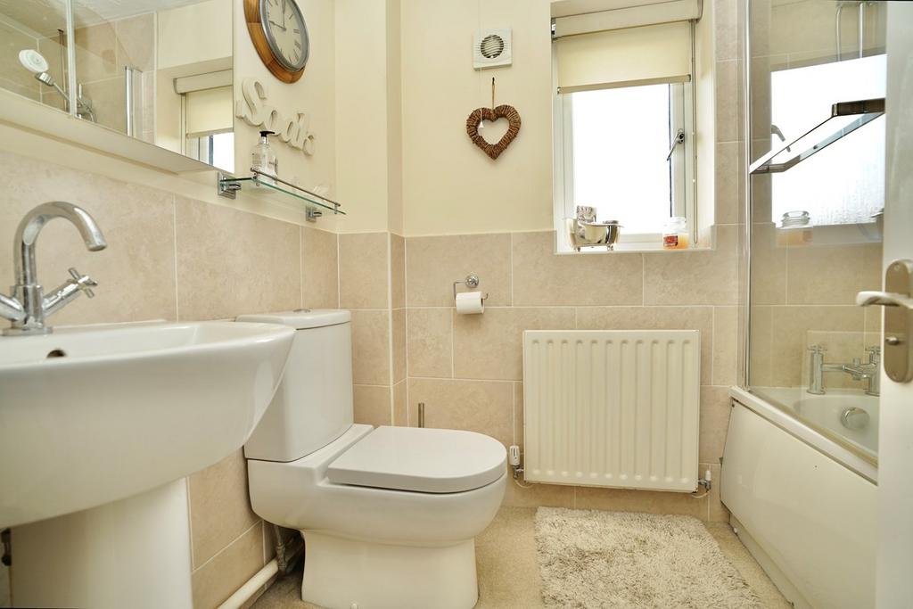 Fitted in a two piece white suite comprising low level WC, vanity wash hand basin with mixer tap, single panel radiator, UPVC window to front aspect, fuse box and master switch, extensive tiling, composite flooring.