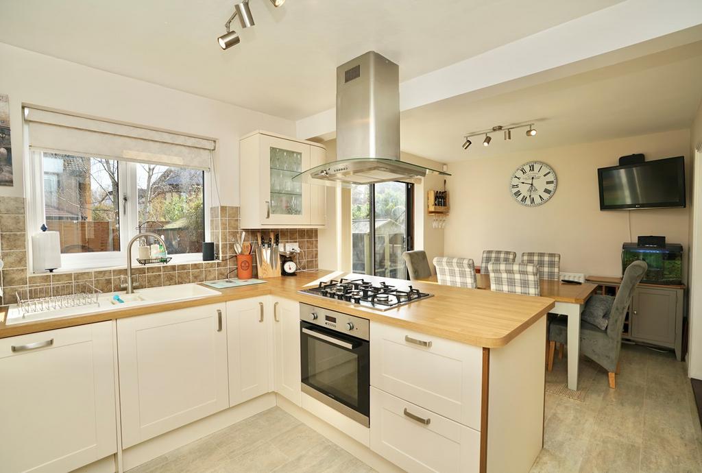 This light contemporary open plan space has been thoughtfully reconfigured by the current owners and re-fitted in a range of cream shaker style base and wall mounted cabinets with complementing work surfaces an re-tiled surrounds, single drainer one and a half bowl resin sink unit with mixer tap, central peninsular breakfast bar incorporating five ring gas hob with suspended extractor unit fitted above, integral stainless steel electric oven, Bosch automatic dishwasher and glass fronted display cabinets and lots of cupboard storage, UPVC window and French doors to garden terrace to the rear, under stairs storage cupboard, composite floor covering.