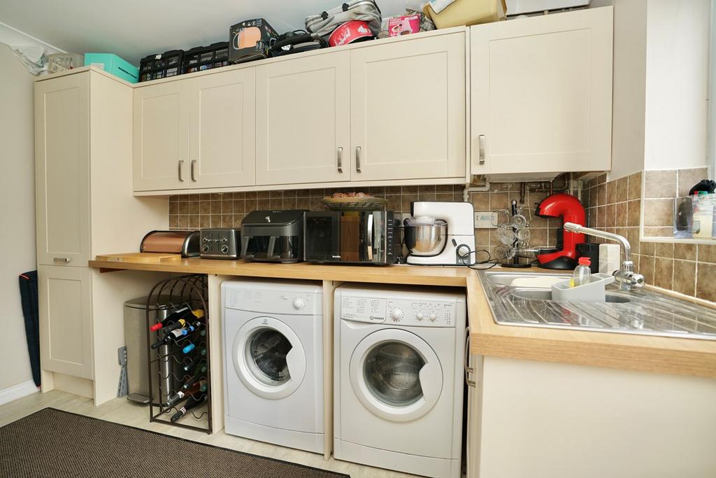 Fitted in a range of cream Shaker style cabinets with complementing work surfaces and tiling, single drainer one and a half bowl stainless steel sink unit with mixer tap, extensive tiling, UPVC door and window to garden aspect, concealed gas fired central heating boiler (approximately 12 months old) serving hot water system and radiators, appliance spaces, larder unit, space and plumbing for American style fridge freezer, coving to ceiling.
