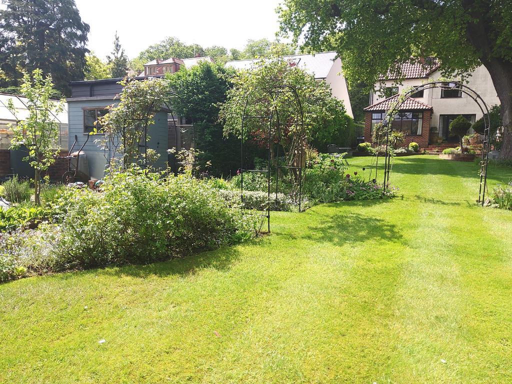 The rear garden is laid to lawn with well-kept and stocked borders and beds along with paved patio areas and a path leads to the: