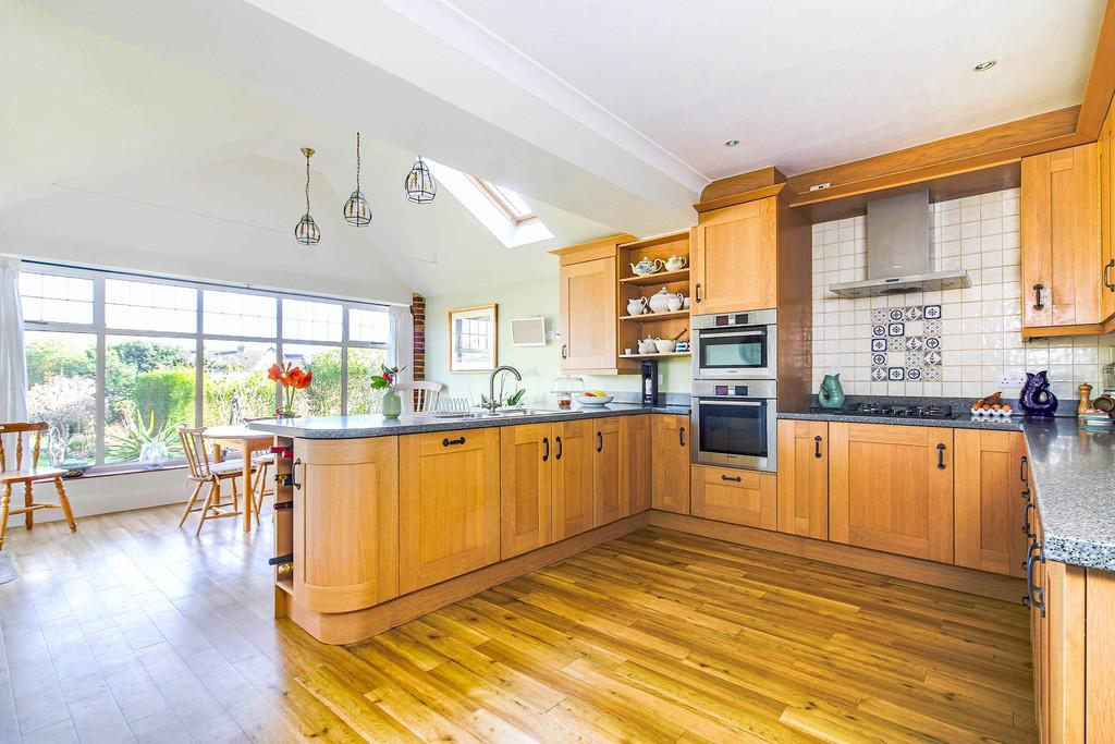 BREAKFAST KITCHEN 20' 8" x 14' 4" max (6.3m x 4.37m) Fitted with oak-fronted base and wall units incorporating appliances. Semi-vaulted ceiling with skylight and picture window affording garden views.
