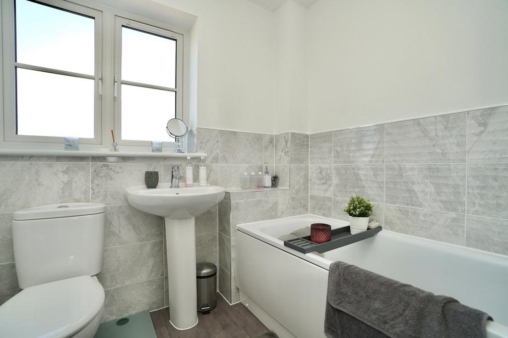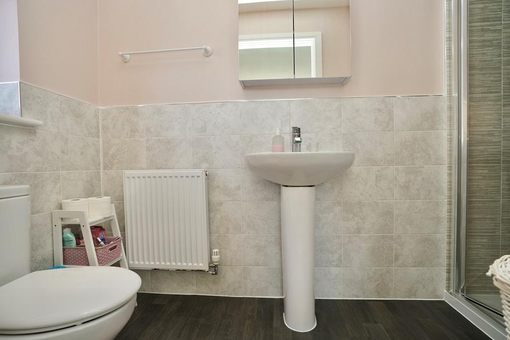 Fitted in a three piece white suite comprising low level WC, pedestal wash hand basin with mixer tap, panel bath with mixer tap, recessed lighting, extractor, UPVC window to front aspect, double panel radiator, composite flooring.