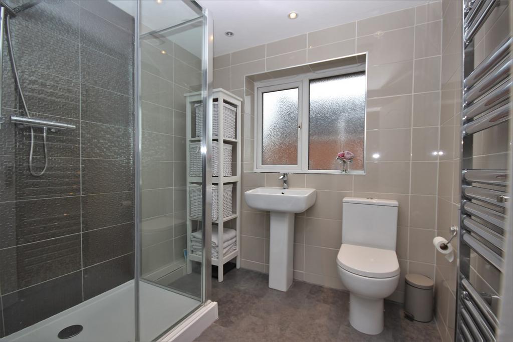 Tiles to wall and floor, ceiling spot lights, UPVC double glazed obscured window, chrome heated towel rail, chrome shower cubicle, pedestal hand wash basin & low level W/C.