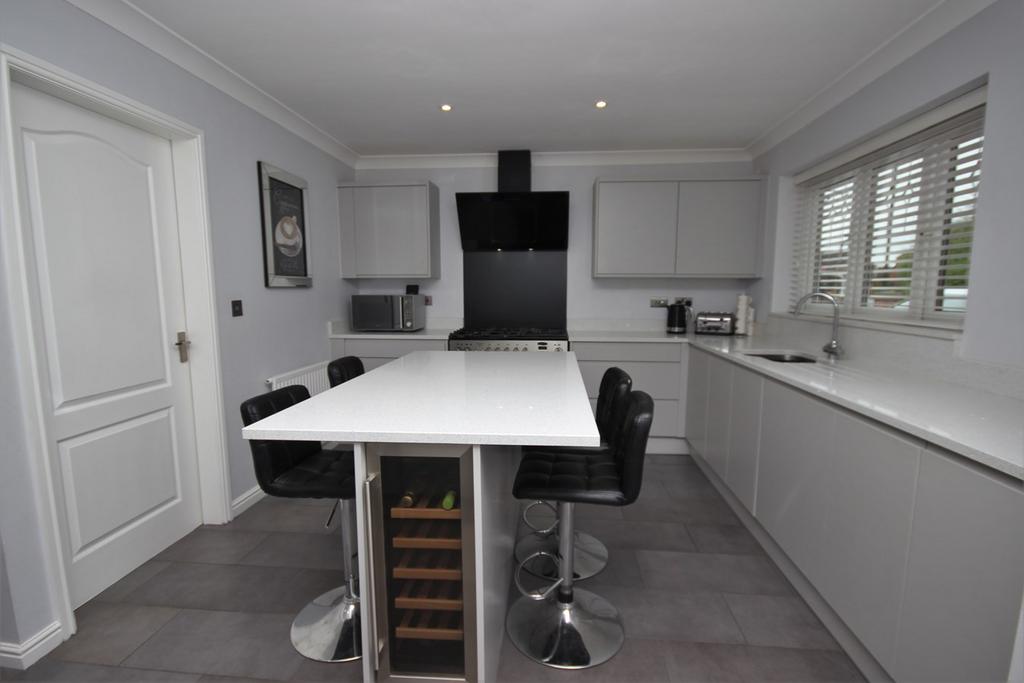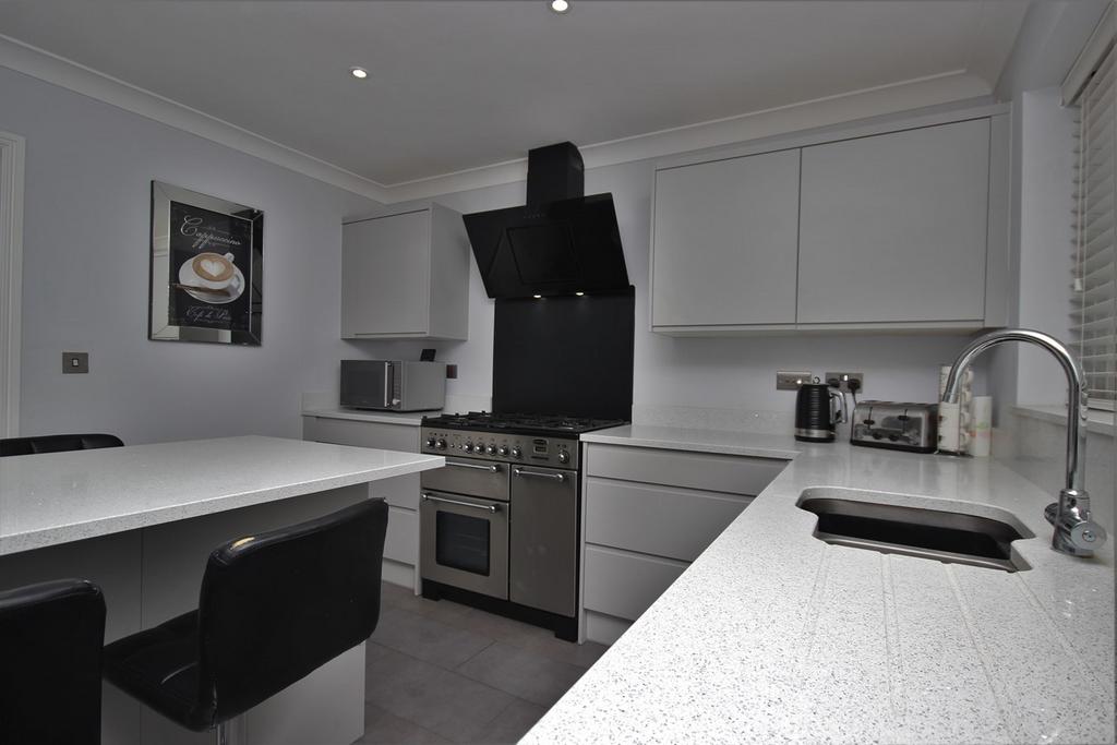 Tiles to floor, ceiling spot lights, radiator, UPVC double glazed windows. Kitchen comprises of a range of modern bespoke wall & base units with beautiful quartz worktops over carried through to kitchen island. Kitchen boasts a range style cooker with extractor canopy over, integrated appliances and wine cooler, stainless steel sink with mixer tap.