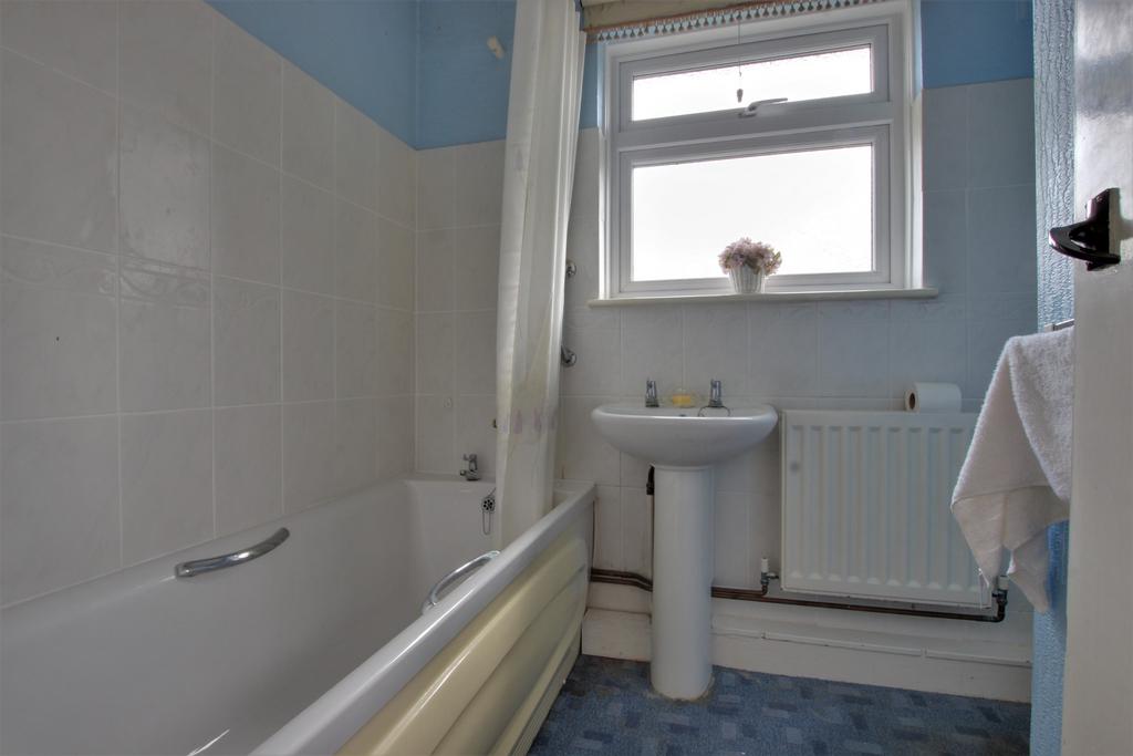 Panelled bath with shower attachment. WC. Ceramic sink. Radiator. Frosted double glazed window.