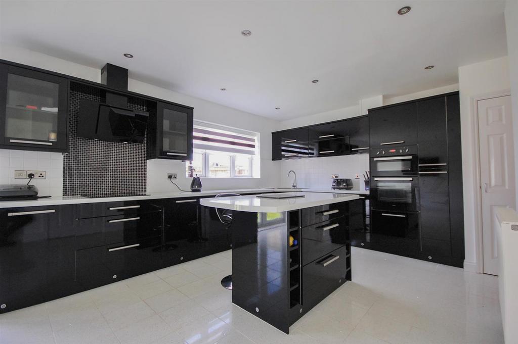 Kitchen - 7.00m x 2.00m (22'11" x 6'6") - A beautiful fitted kitchen with a range of wall and base units. finished in a gloss black. Contrasting gloss white marble worktops with integrated hob and cooker. Gloss white tiles to the floor. French doors leading to the rear garden. Window to the rear aspect. Storage cupboard. Radiator. Access to Utility Room.