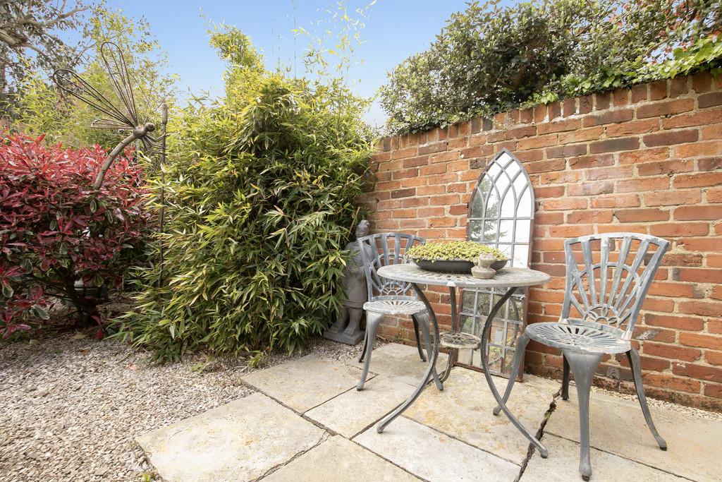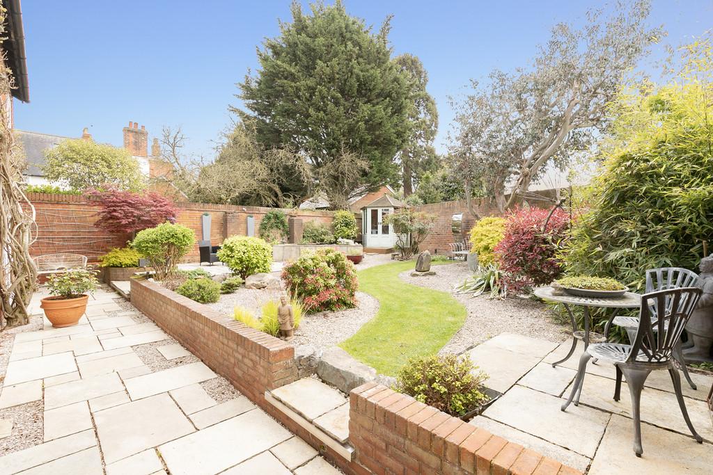 The rear garden is roughly square and is enclosed by walling. Laid out to a low-maintenance design, the garden features paved sitting areas, a retained pond and planted beds and borders with trees and shrubs.