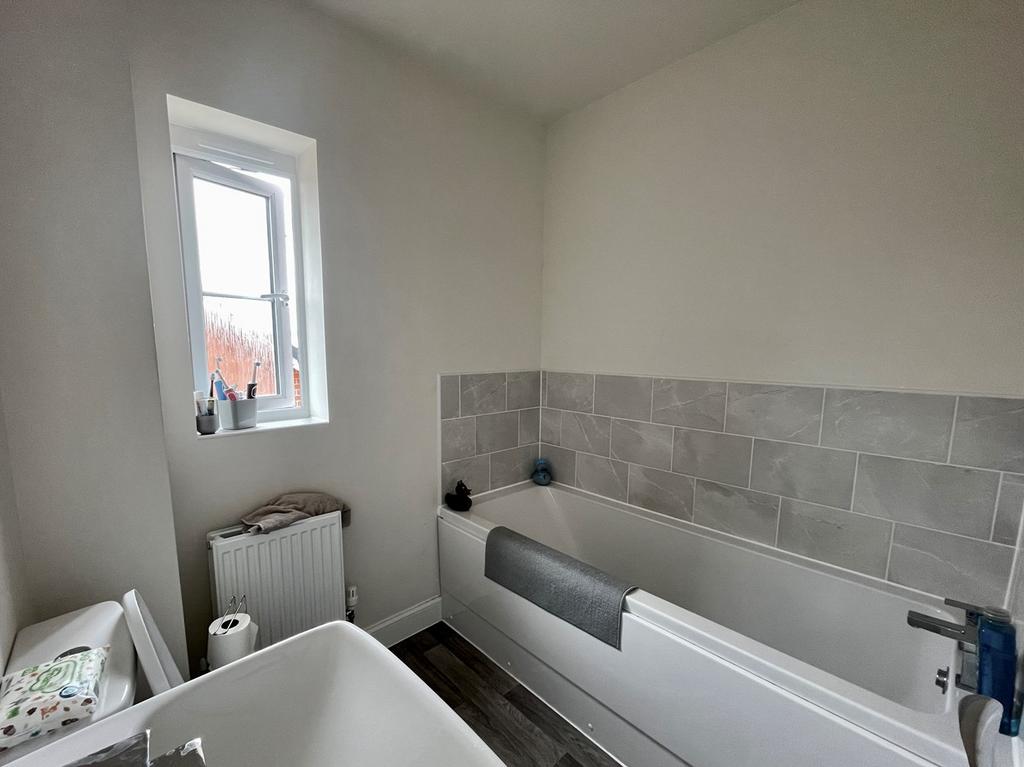 with window to side, panelled bath, low flush w.c., pedestal wash basin, tiled splashbacks, radiator, extractor fan.