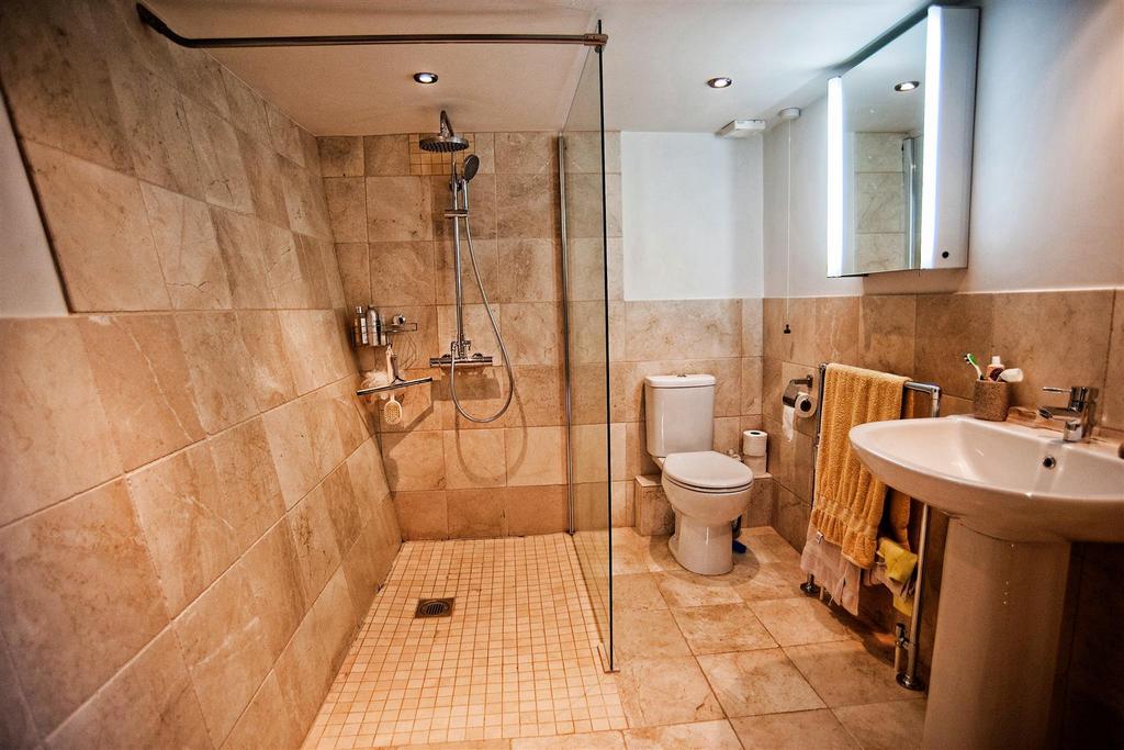 Being appointed with a coloured suite to include close coupled wc, bath with mixer shower attachment, pedestal wash hand basin, glazed and tiled shower enclosure, radiator, extractor fan, heated towel radiator, part tiled walls and sash window.