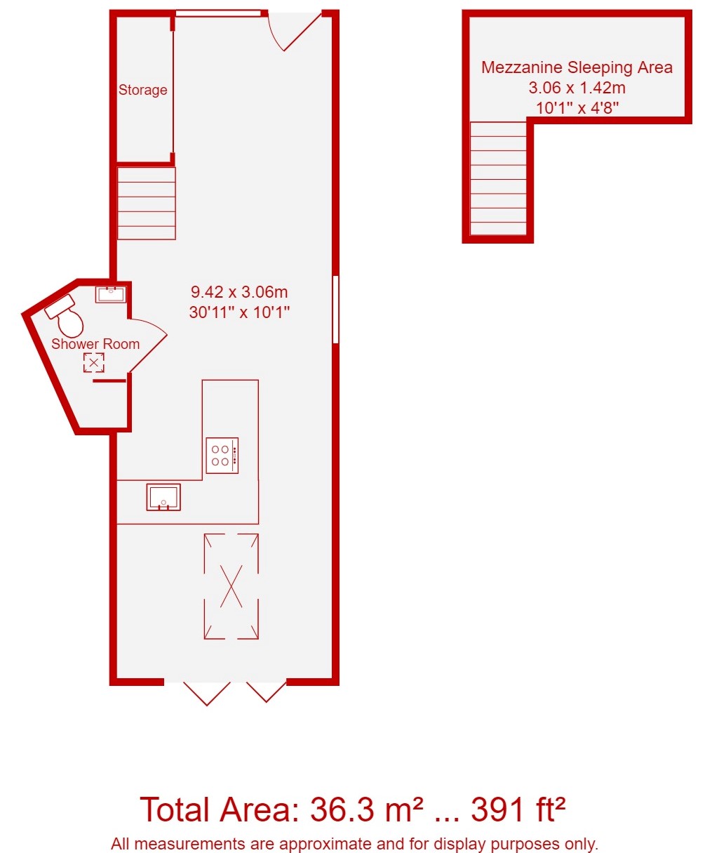 Ground Floor: Open Plan Living Room * Kitchen Area * Shower Room * Mezzanine Area. Outside: South Facing front Patio, walled rear Court Yard.