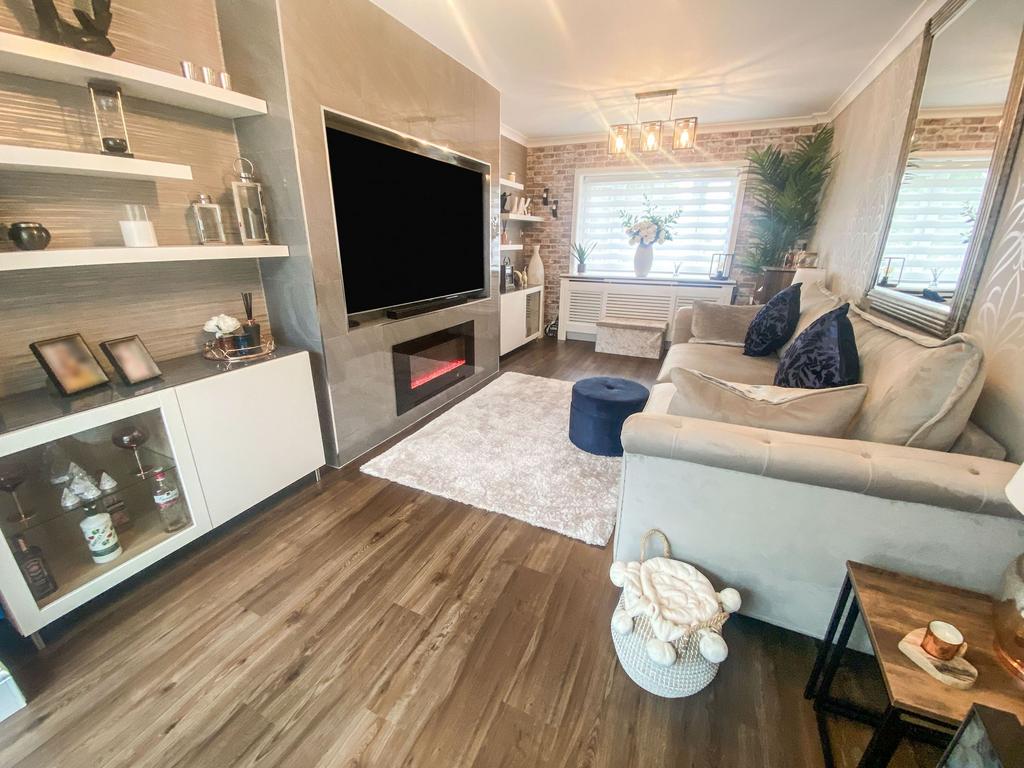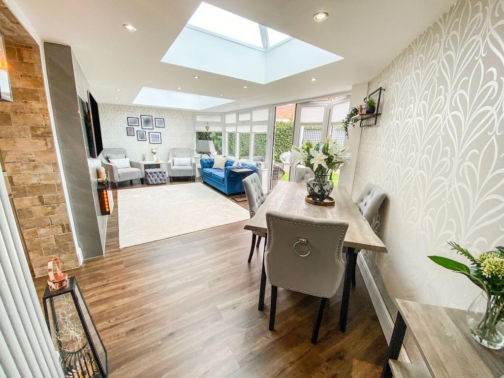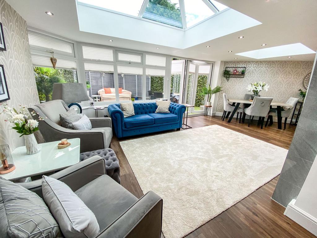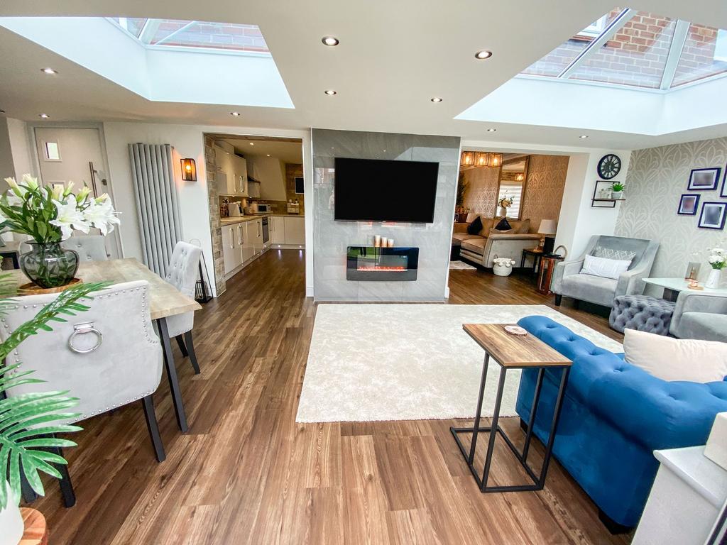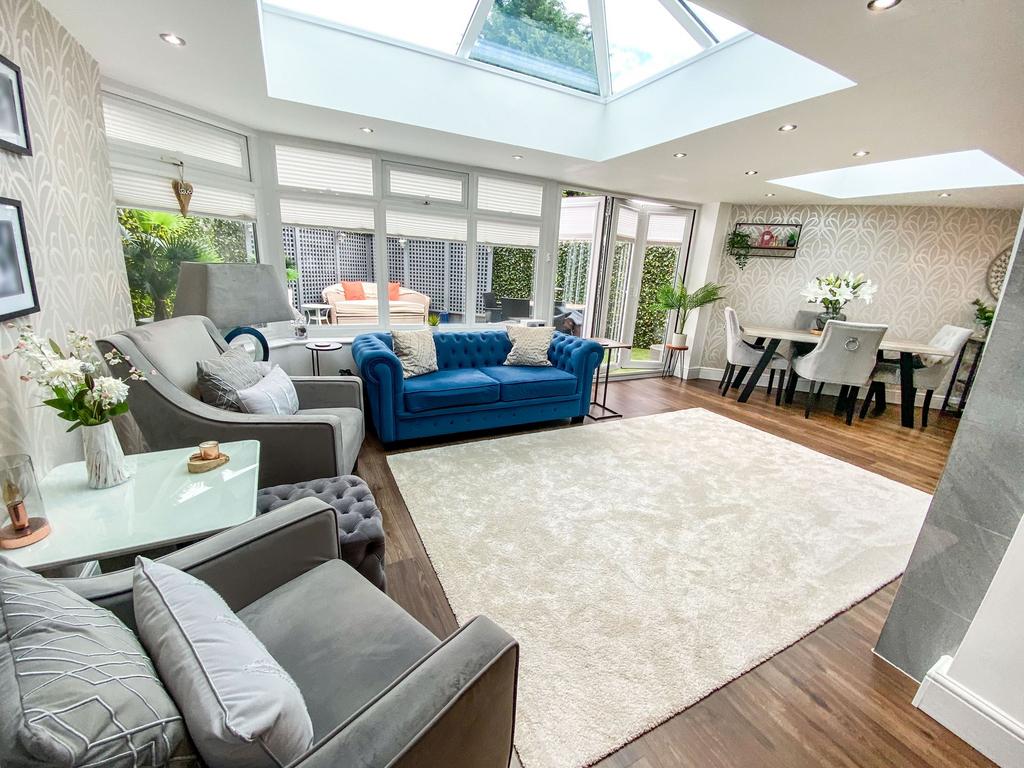 Open plan space with access to living room and kitchen/diner. Bi fold doors open to the garden and lantern windows to the roof, radiator and door to side elevation. Feature fire. Measured to the maximum dimensions.