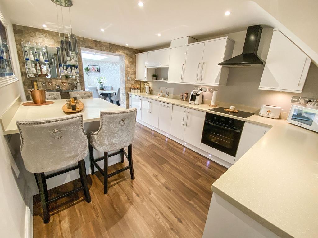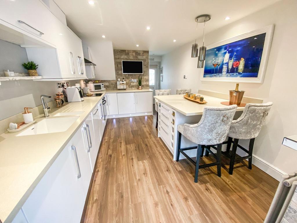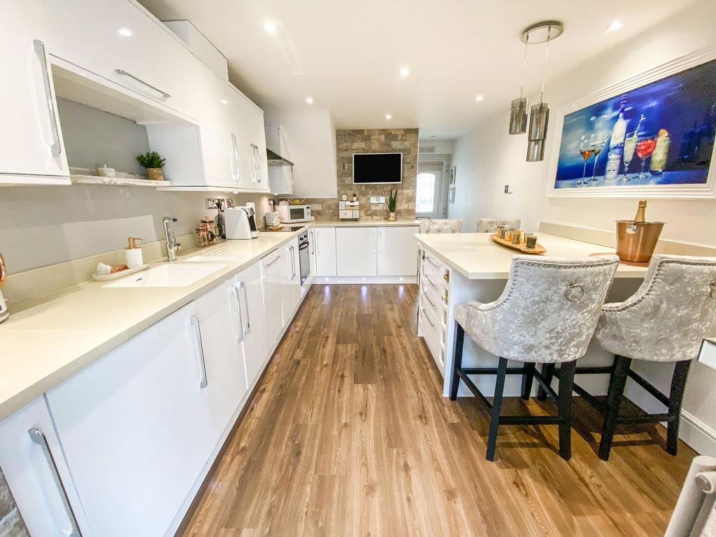 Fitted kitchen with comprehensive wall and base unit with beautiful stone work top over and extending too a generous island unit with additional storage and breakfast bar over. Inset sink unit with mixer tap. Integrated dishwasher, washing machine, fridge/freezer and oven with ceramic hob.