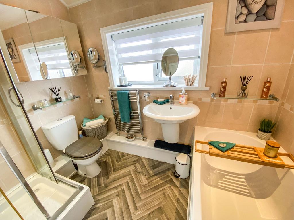 Comprising wall hung wash hand basin, w.c and panelled bath. Separate shower cubicle. Window and radiator.