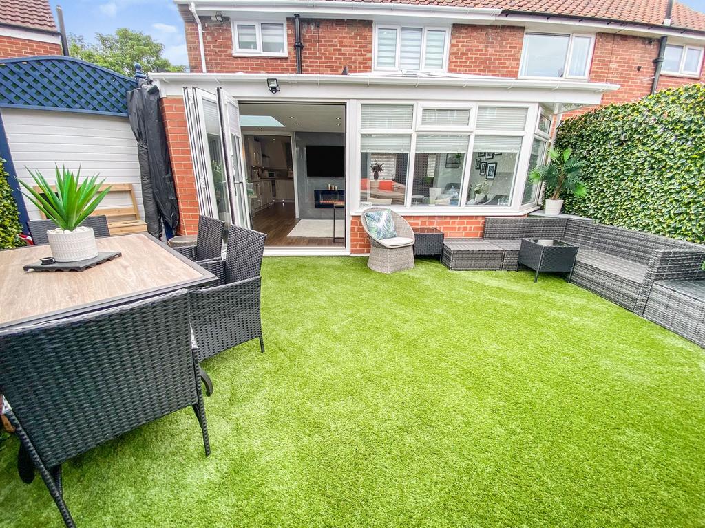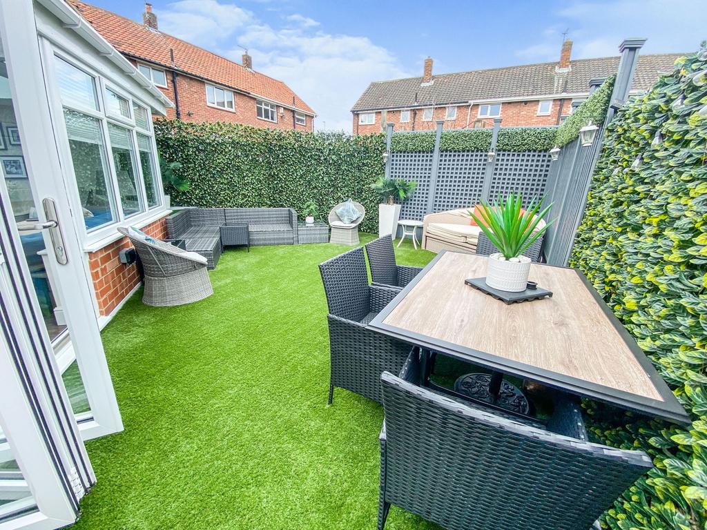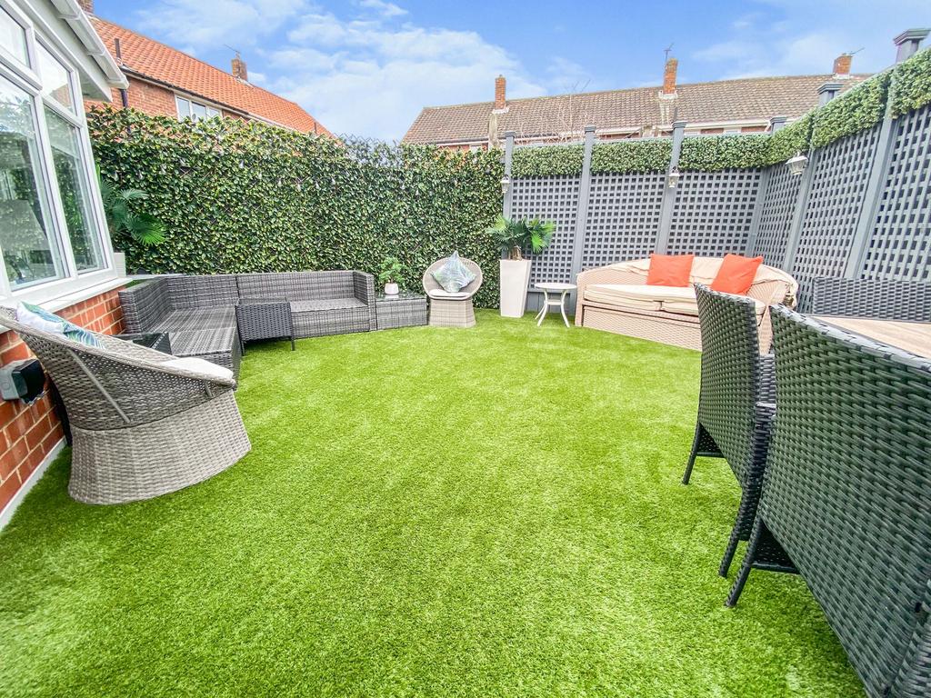 Enclosed garden, landscaped with artificial lawn and timber boundary. Gated access.
