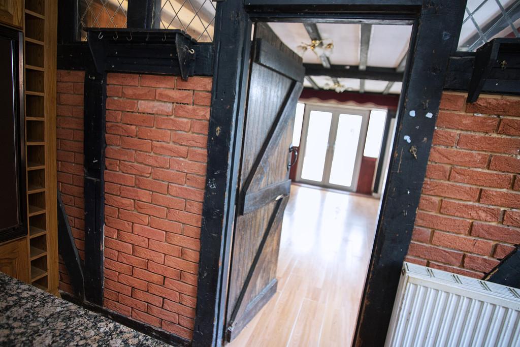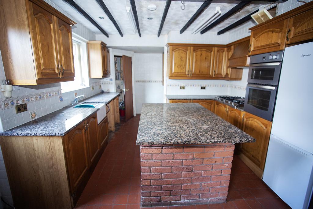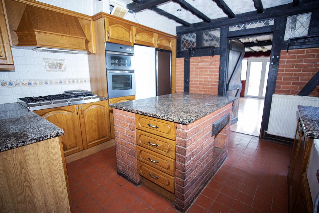 KITCHEN 12' 3" x 11' 10" (3.75m x 3.61m) The Kitchen is generously sized and hosts a separate cupboard where the Worcester Bosch boiler is housed - this also provides additional storage. It comprises a range of solid wood base and wall units with integrated large gas hob and oven and a centre island feature with granite work surfaces. There are quarry style floor tiles and a uPVC double-glazed window in front of the sink and also a door giving access to the side of the property. With solid Oak beams to the ceiling and a high level oak-framed window feature which leads to the next area of the property, which could be utilised as a Dining Room, entered via a solid dark wood door.