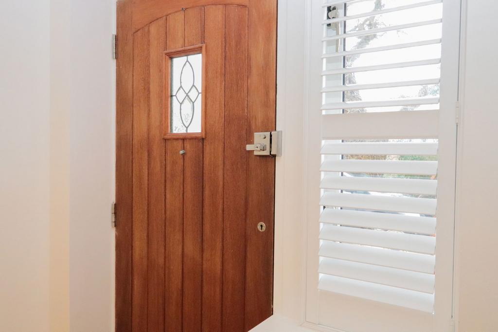 The living room is a welcoming space with a large bay window and additional side windows fitted with louvre shutters, creating a bright yet cosy atmosphere. A separate study at the front of the house provides a quiet retreat for work or hobbies, while a practical utility room and a convenient cloakroom complete the ground floor.