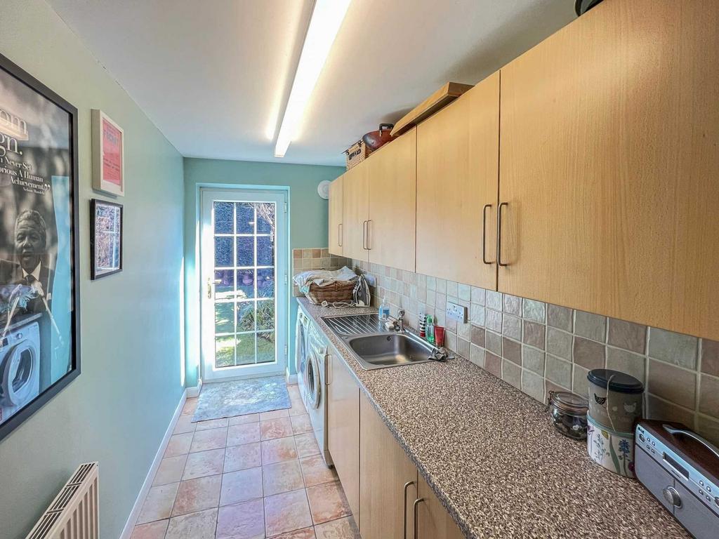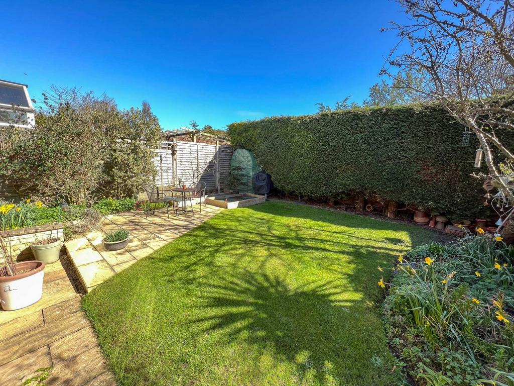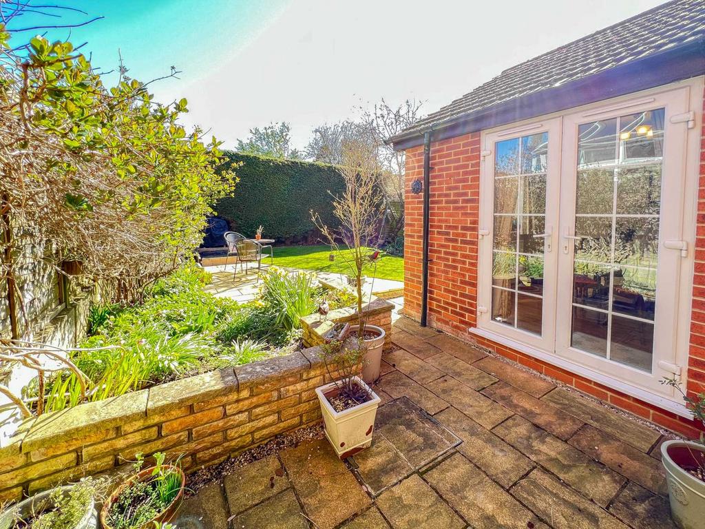 At the front is a gravel area and path to the side. In front of the garage there is a drive/ parking space. The rear garden has a patio immediately to the rear of the house and access to utility and dining room. There is a gravel path and side access gate. There is another patio area to the side and a mature hedge at the rear affording a great deal of privacy.