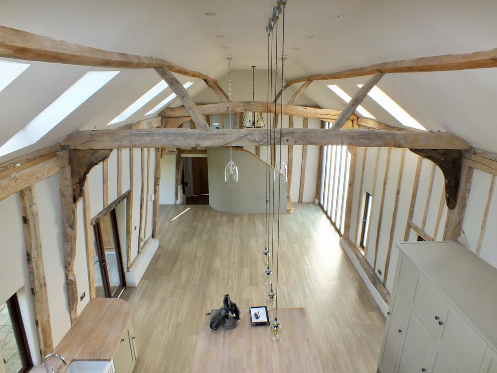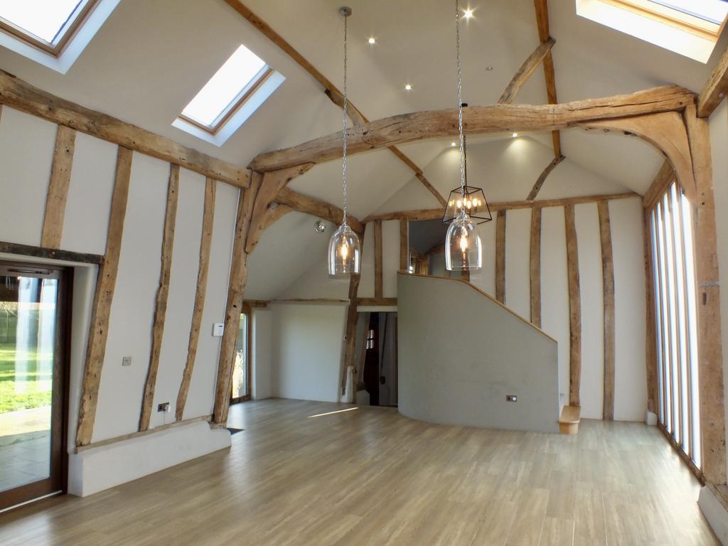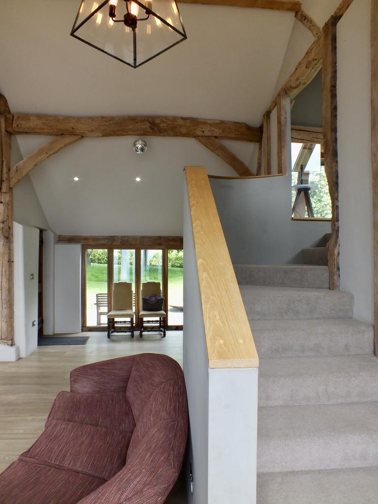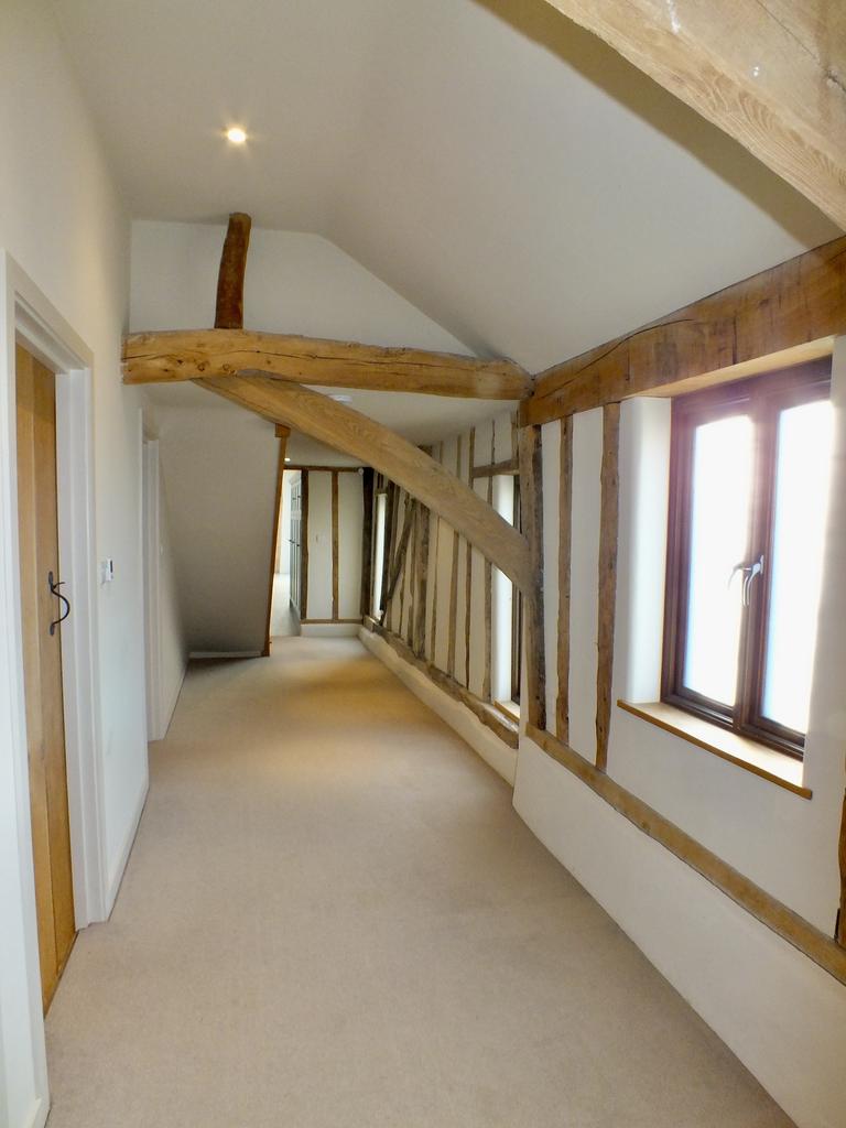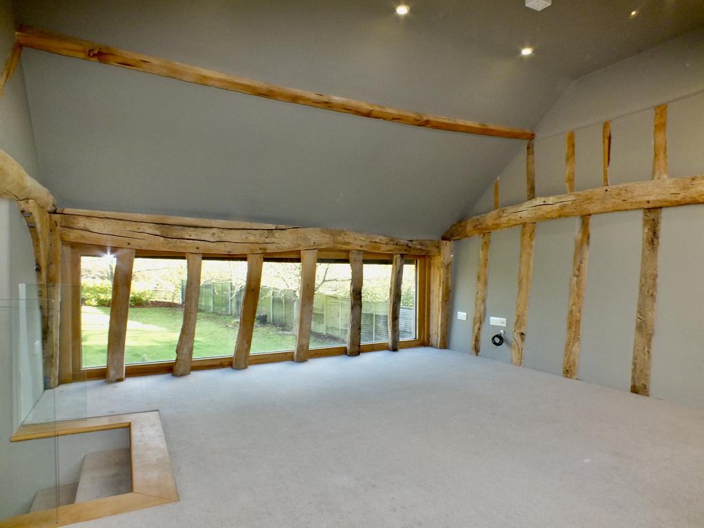 Exposed timbers, Velux windows. Low picture window overlooking the garden. Inset lighting. Glass hand rails.