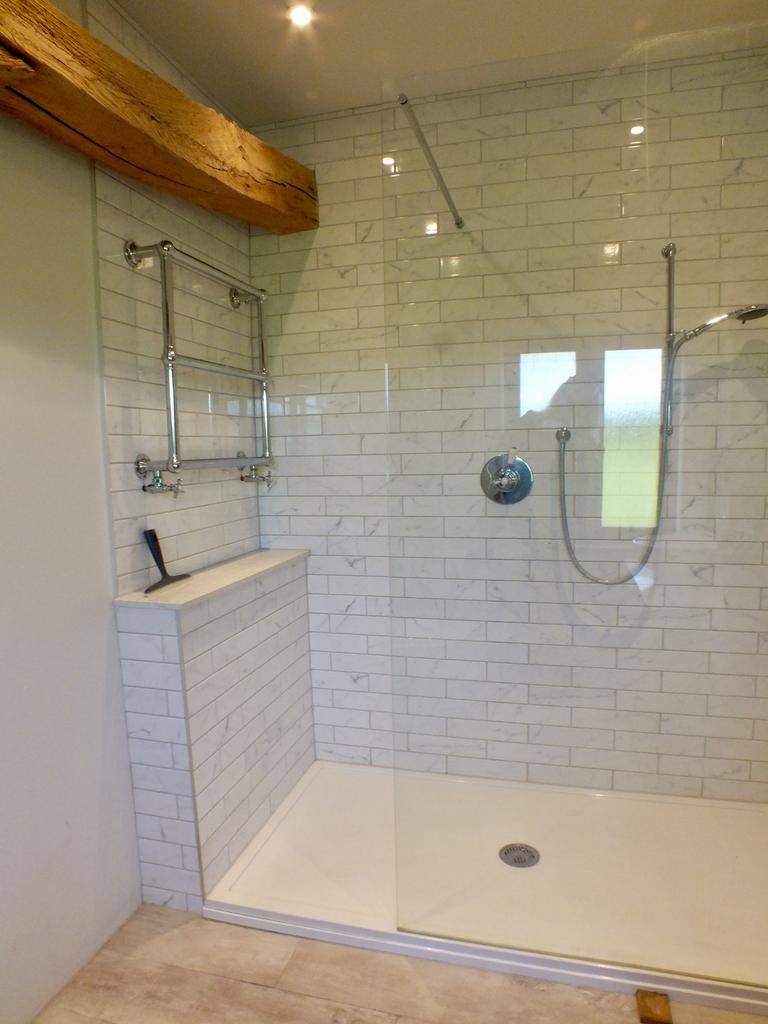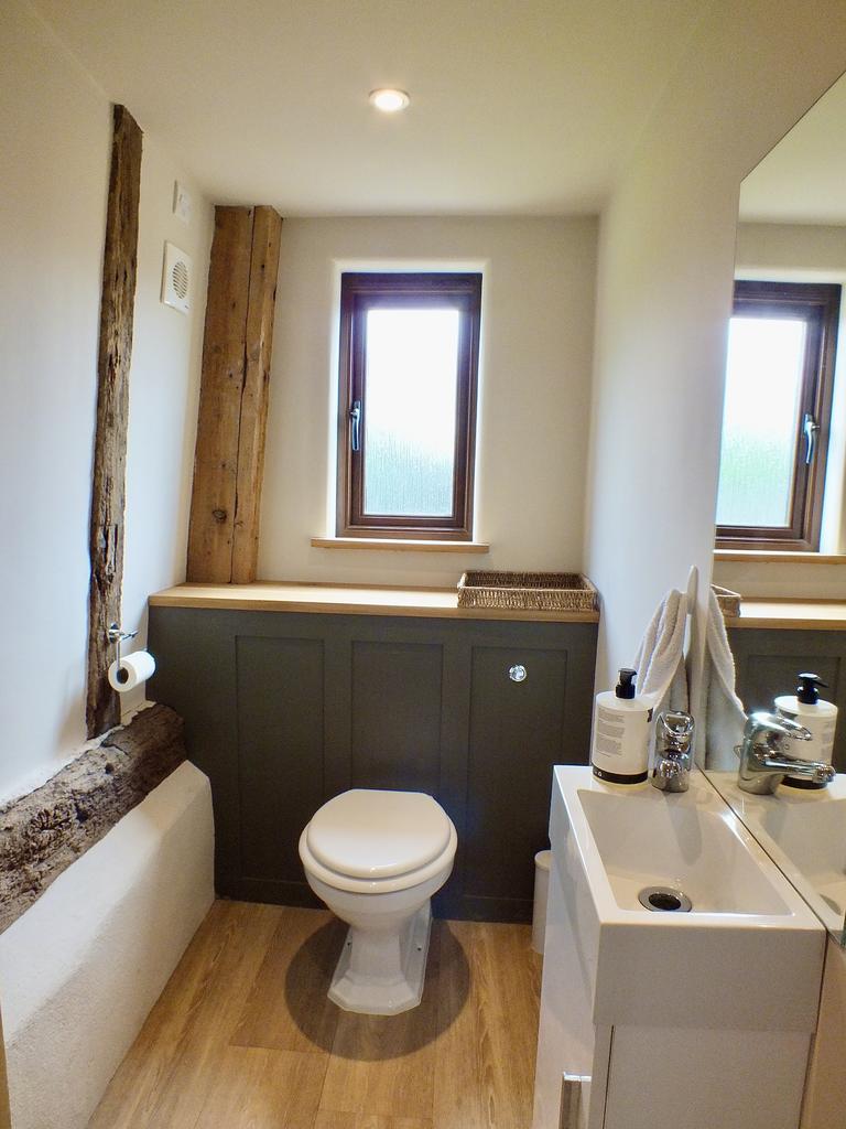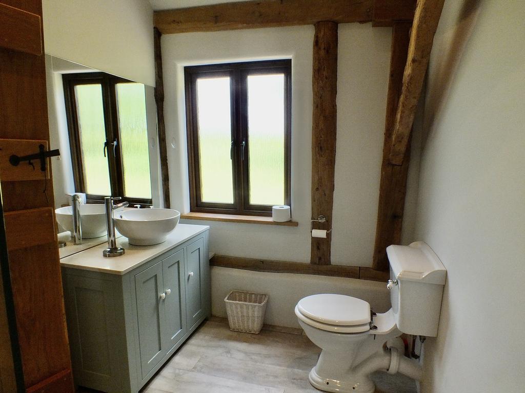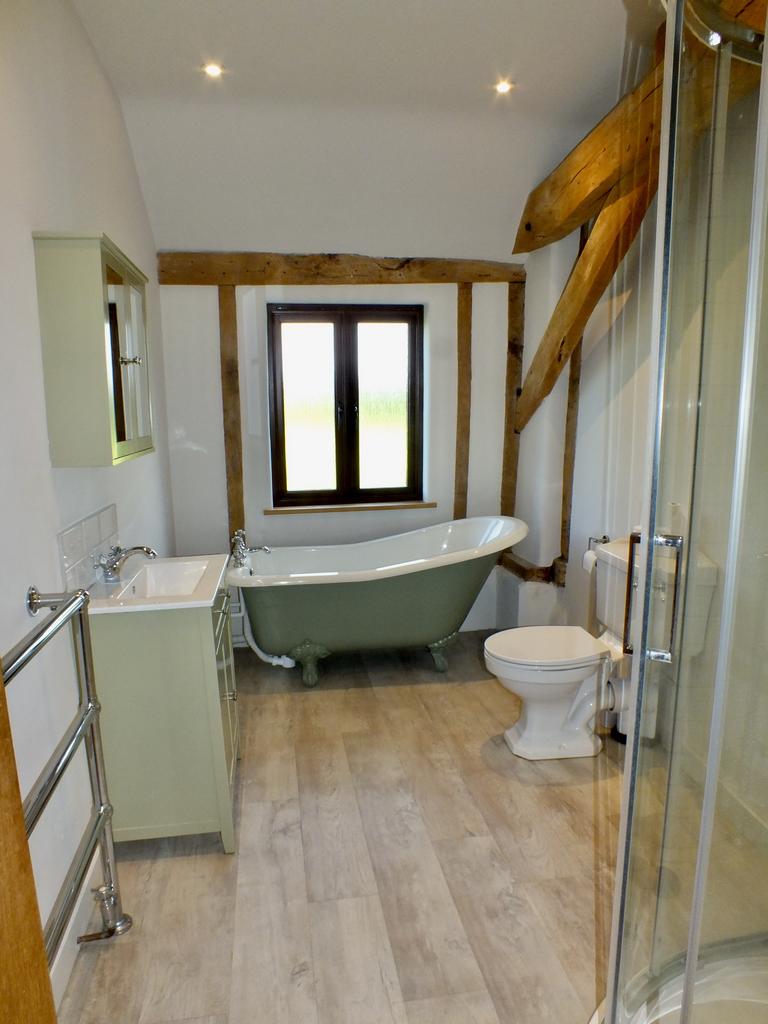 Large corner shower cubicle. Slipper style free standing bath. Vanity unit with wash basin. radiator/heated towel rail. Exposed timbers. Vinyl flooring.