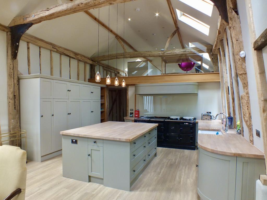 A large open plan living space with partly vaulted ceiling. Steps down to an Inner Hall with access to the Utility and Cloakroom. Velux windows. Exposed timbers. Double doors to Garden. Steps up to first floor Living Room. Hand crafted bespoke Kitchen with range of matching base and wall units. Electric flexible 6 oven AGA with hot plates and ceramic hob. Extractor fans in canopy over. Wooden worktops and inset Butler style sink with mixer tap, driking water tap and Insinkerator. Large island unit with cupboards and under top small fridge. Built in dishwasher. Built in fridge and separate freezer. Steps up to:-