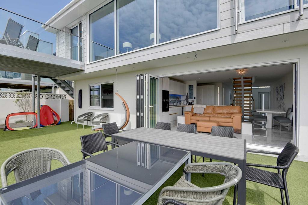 Back garden overlooks the sea from all areas. Hot tub (£200 optional extra) and The Green Egg BBQ. Lots of seating and loungers.