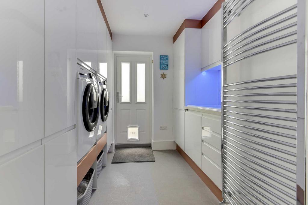 Utility room, 2 washing machines, heated towel rail for drying.