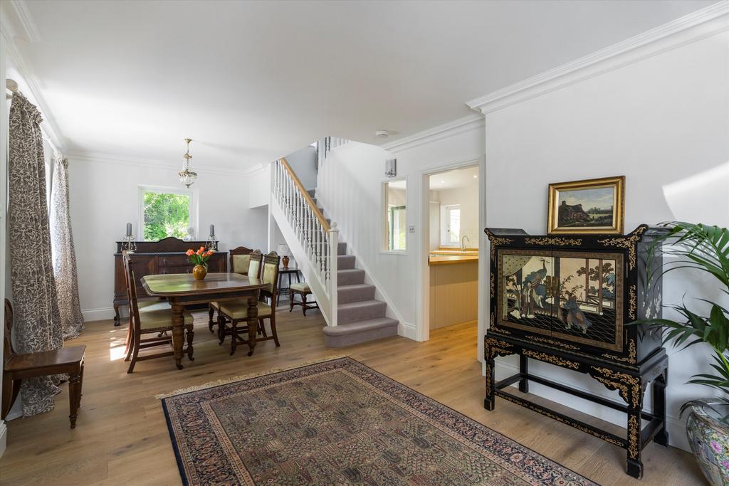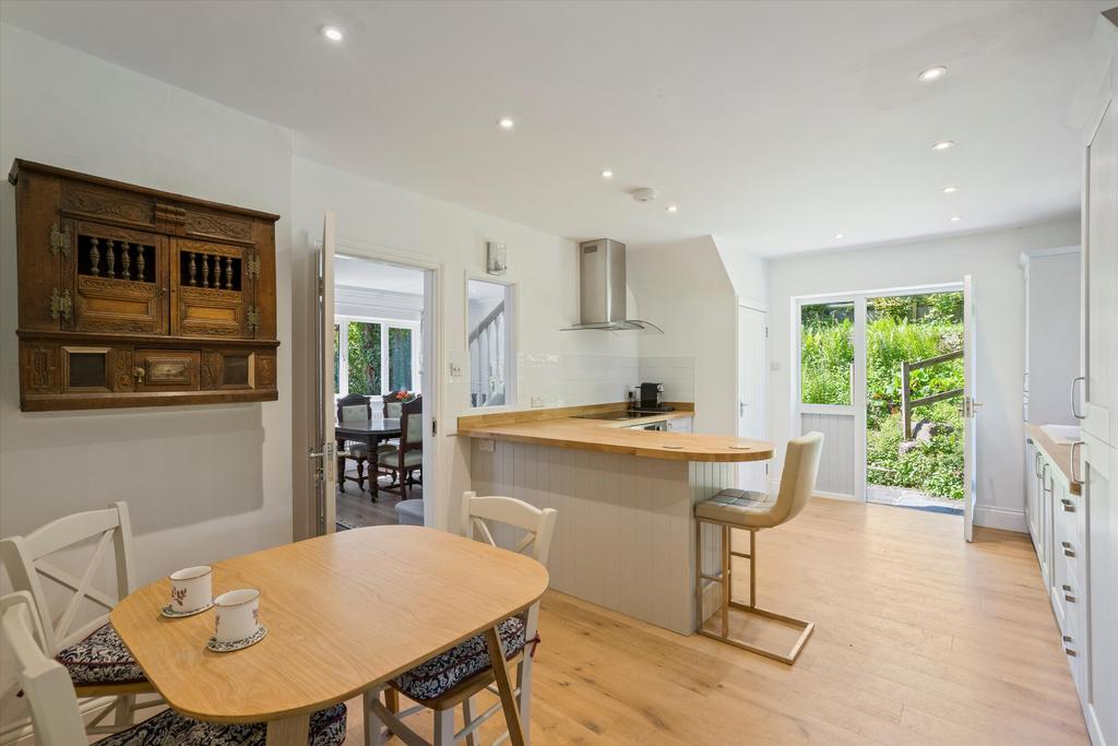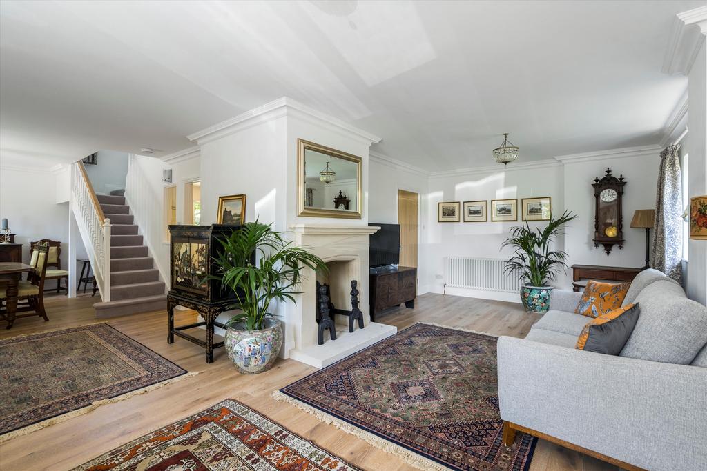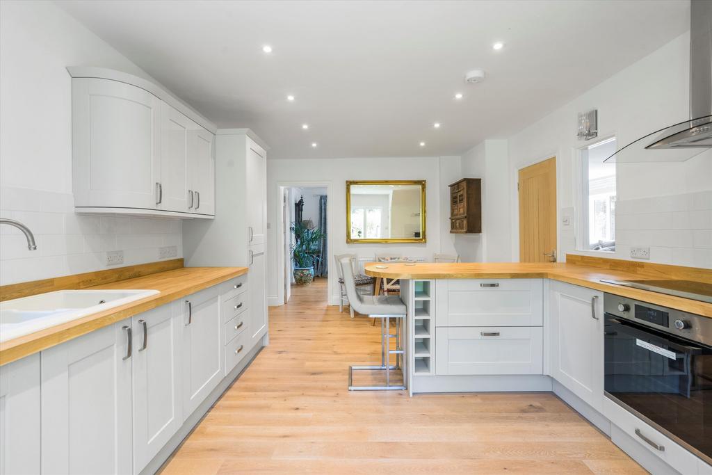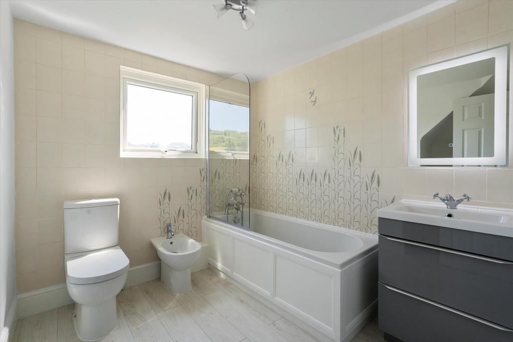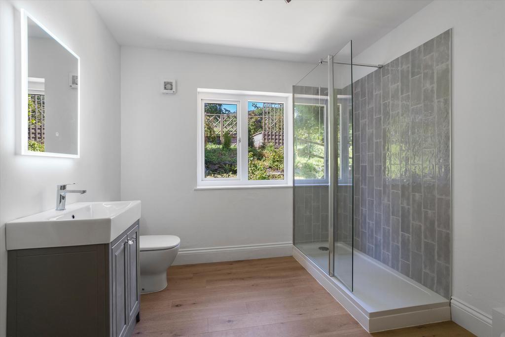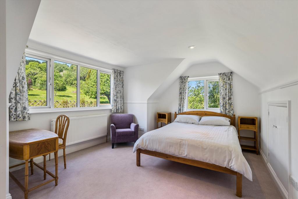 The kitchen/breakfast room has a new Shaker-style kitchen in Dove grey with integral appliances and wooden worktops, and a walk-in larder. A half-glazed door offers access to the garden. The ground-floor double bedroom has its own en suite and access to the garden via French doors. This room has the potential for many different uses. There is also a separate WC for guests. Stairs lead up to a light-filled landing and well-proportioned accommodation, with new carpet throughout. The largest of the bedrooms has dual-aspect windows with countryside views, copious storage and a built-in wardrobe. The second upstairs bedroom has views to the front garden and beyond and a built-in wardrobe and alcove storage cupboard. There is a family bathroom and a cupboard on the landing, housing the new 'Hive' controlled heating system.
