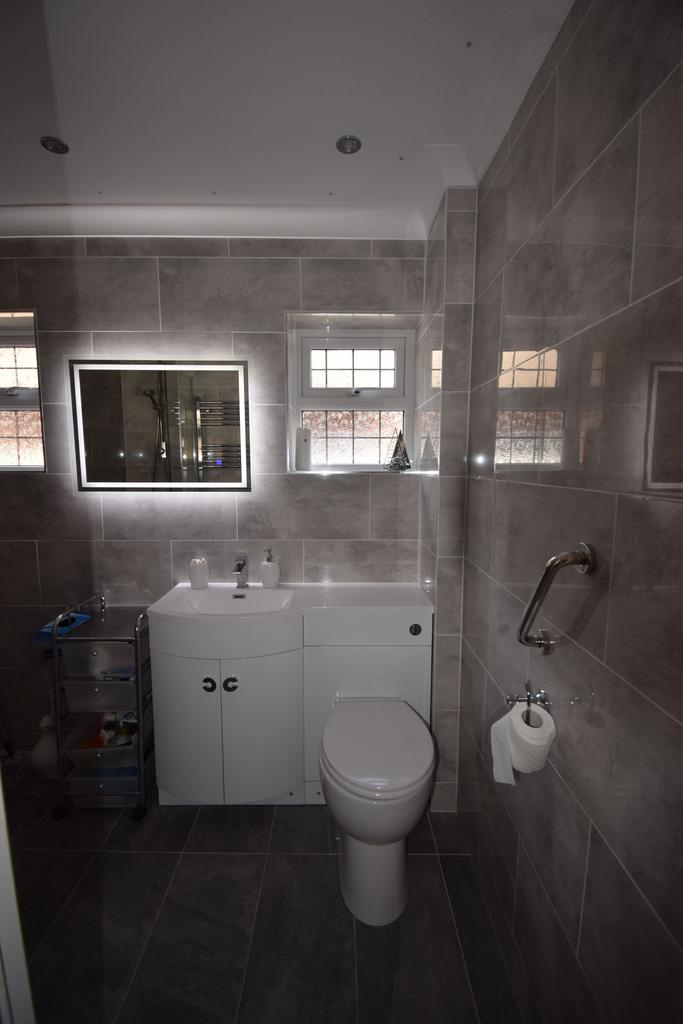LED ceiling lights and spots, touch screen light up mirror, chrome towel radiator.