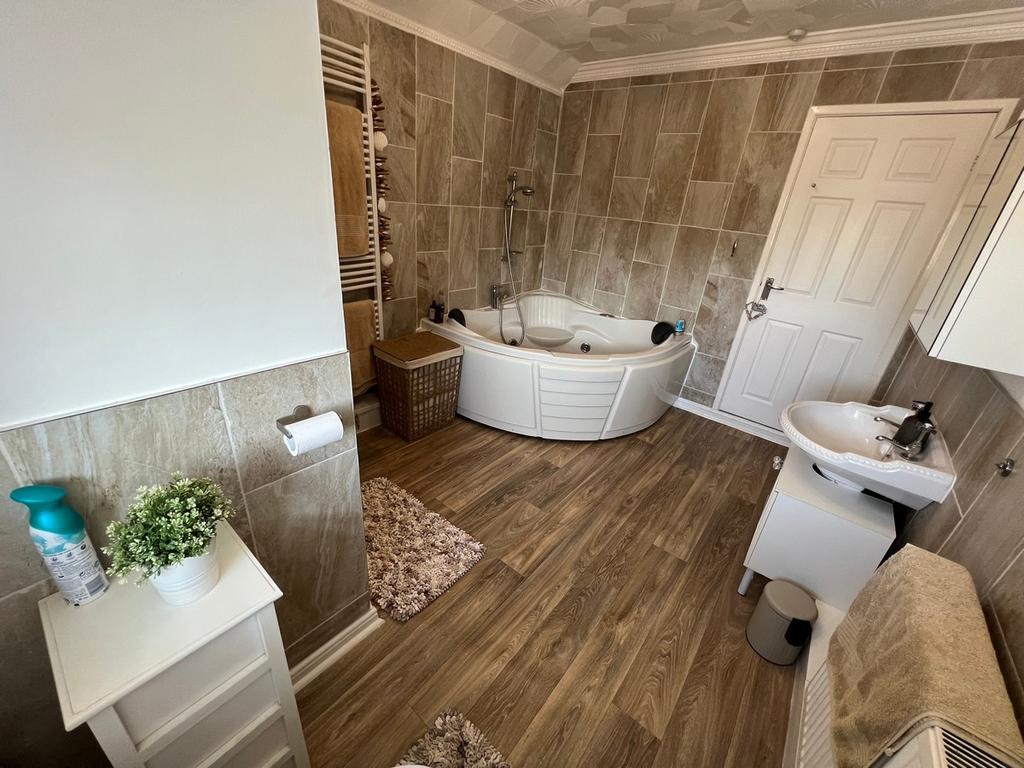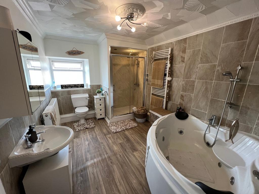 Patterned glaze UPVC double-glazed window to rear, quality tiled décor to halfway, complete to two walls, plastered emulsion décor above, patterned artex and coved ceiling with central pendant ceiling light fitting, cushion floor covering, radiator, white oversized heated towel rail, white bathroom suite comprising low-level WC, wash hand basin with vanity mirror above, double walk-in shower cubicle with recess lighting and overhead rainforest shower with attachments supplied direct from combi system, oversized jacuzzi corner bath with seating area and twin neck pillows with central mixer taps and shower attachments, all fixtures and fittings to remain.