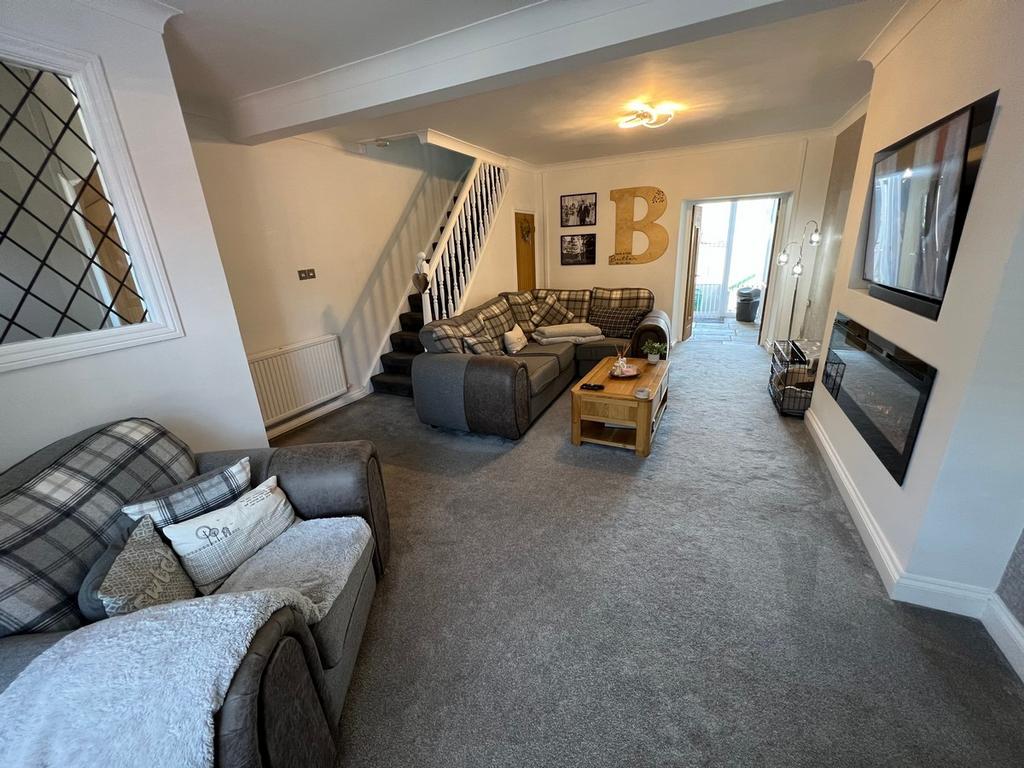 UPVC double-glazed sash-effect window to front with made to measure blinds, plastered emulsion décor with one feature wall papered, plastered emulsion and coved ceiling with two modern pendant ceiling light fittings, quality new fitted carpet, three central heating radiators, ample electric power points, gas service meters housed within base recess storage cabinet, light oak panel door to understairs storage facility, open-plan stairs to first floor elevation with matching fitted carpet and spindled balustrade, feature wall with recess ideal for flatscreen television, modern insert electric fire to remain as seen, modern double light oak glazed panel doors to rear allowing access to kitchen/diner.