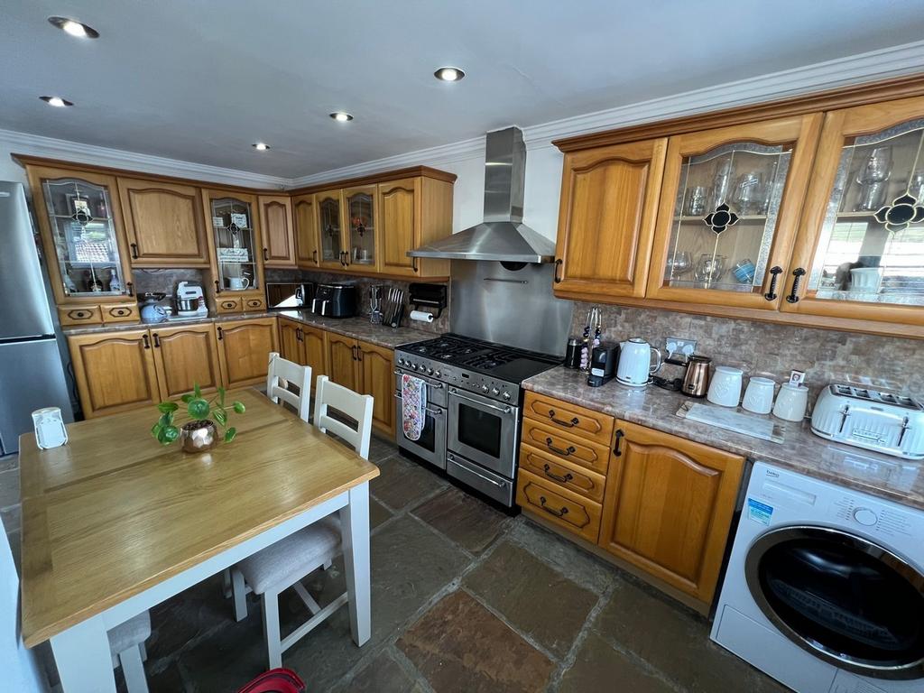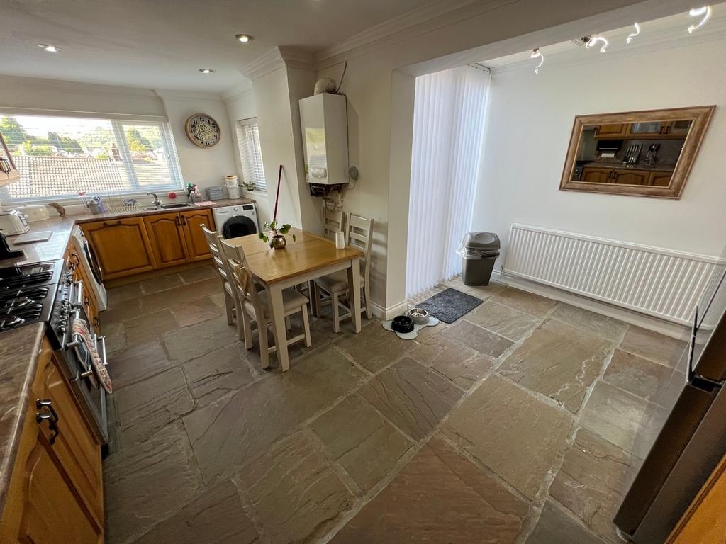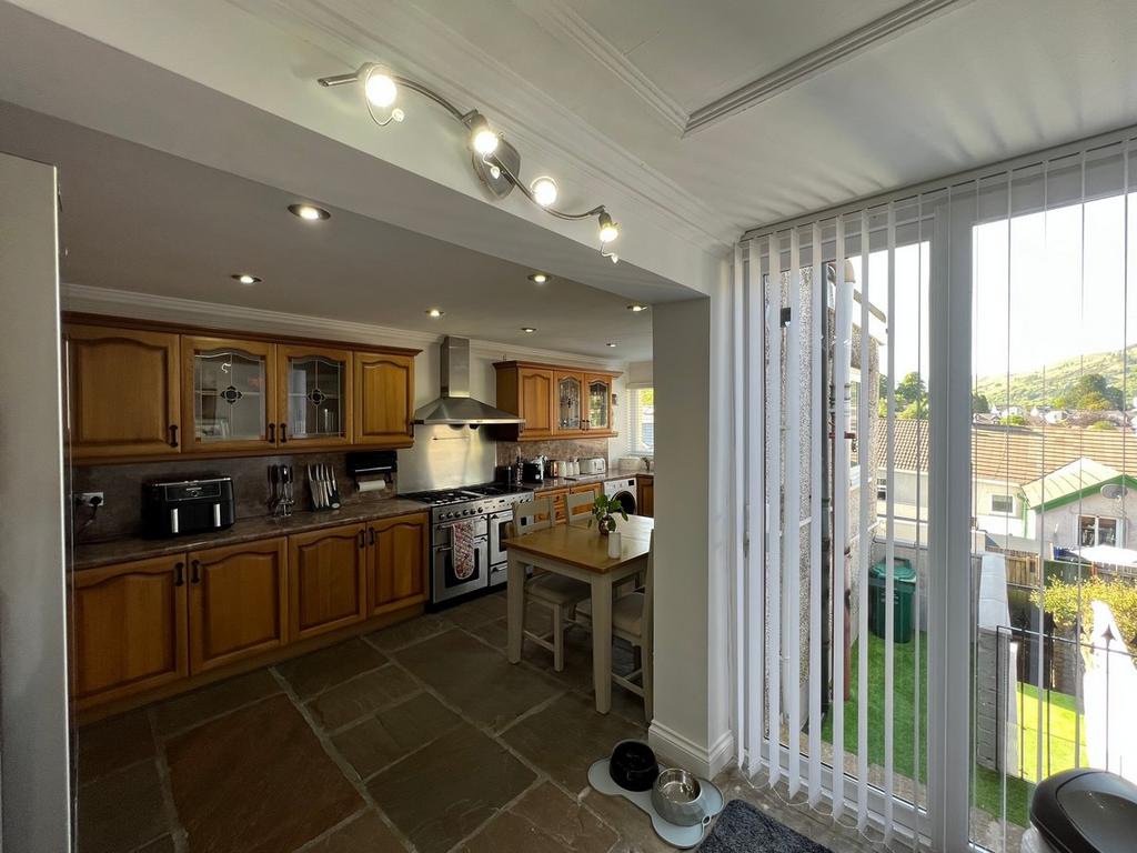 UPVC double-glazed windows to side and rear both with made to measure blinds offering unspoilt views over the surrounding mountains, plastered emulsion décor and ornate coved ceiling with full range of recess lighting, quality flagstone floor-effect flooring, wall-mounted gas combination boiler supplying domestic hot water and gas central heating, full range of light oak fitted kitchen units comprising ample wall-mounted units, base units, drawer packs, display cabinets, corner display shelving, ample work surfaces with matching splashback, integrated dishwasher, single sink and drainer unit with central mixer taps, plumbing for automatic washing machine, ample space for additional appliances, freestanding five ring cooking range with extractor canopy fitted above to remain as seen, ample space for additional appliances, ample space for dining table and chairs if required, UPVC double-glazed patio doors to rear overlooking and allowing access to gardens with unspoilt views with made to measure blinds to remain as seen.